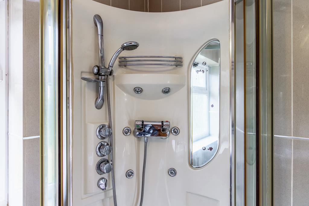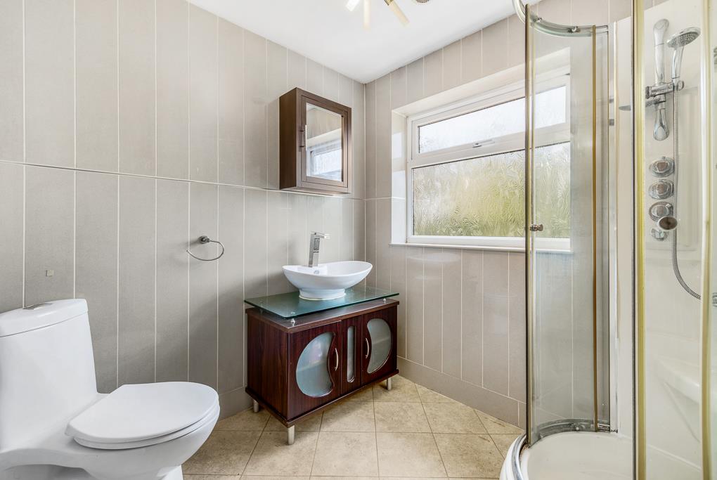 PVC double glazed window to rear. Shower cubicle with shower and glass sliding doors. Toilet. Wash hand basin with vanity unit under. Tiled walls. Radiator.