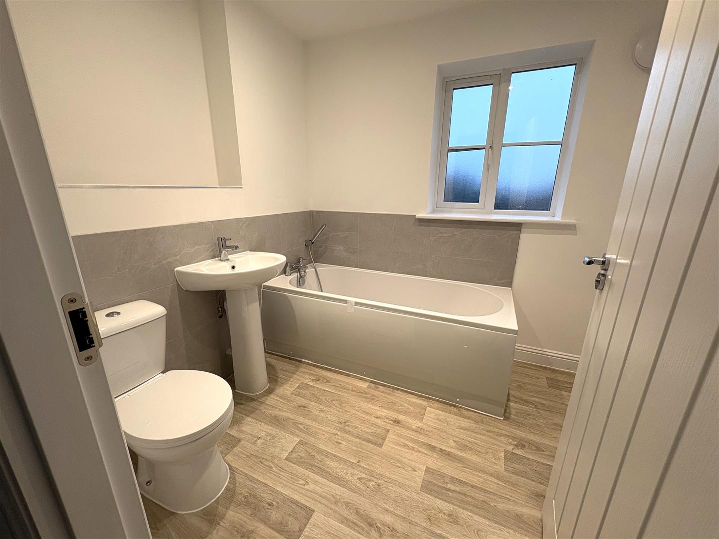 UPVC window to front aspect. toilet, wash hand basin, vinyl flooring, shower over bath, radiator