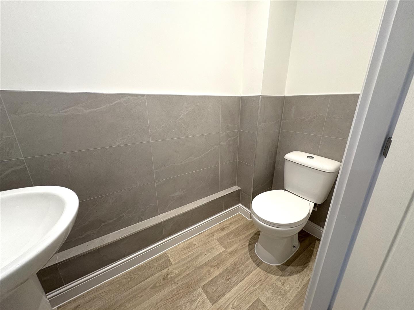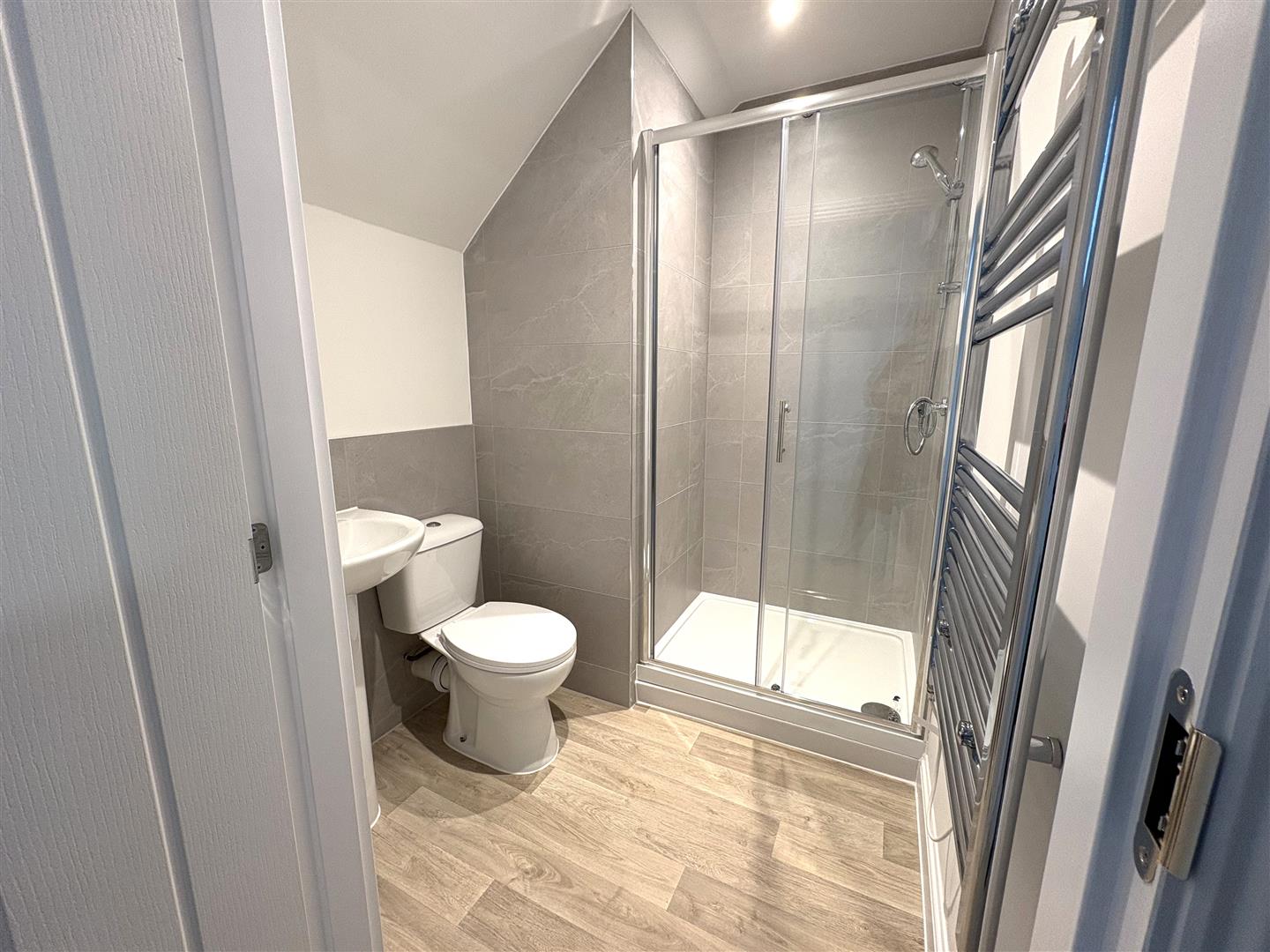 Upvc to rear aspect, toilet, wash hand basin, vinyl flooring, enclosed shower, towel radiator