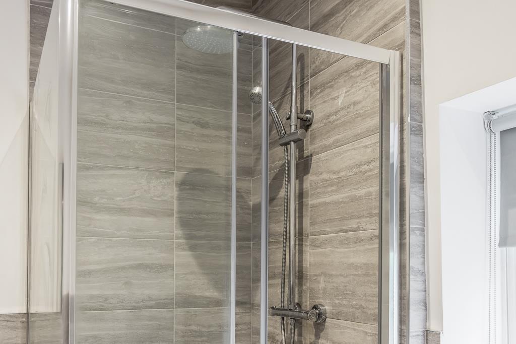 UPVC window to rear. Spot lighting. Shower cubicle with rainwater head and separate shower extension over. Vinyl flooring. Wall mounted heated towel rail. Panelled bath with mixer tap. Partially tiled walls. Wash hand basin set in vanity unity. Toilet.