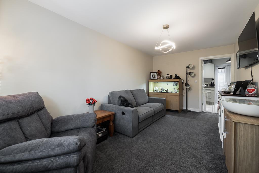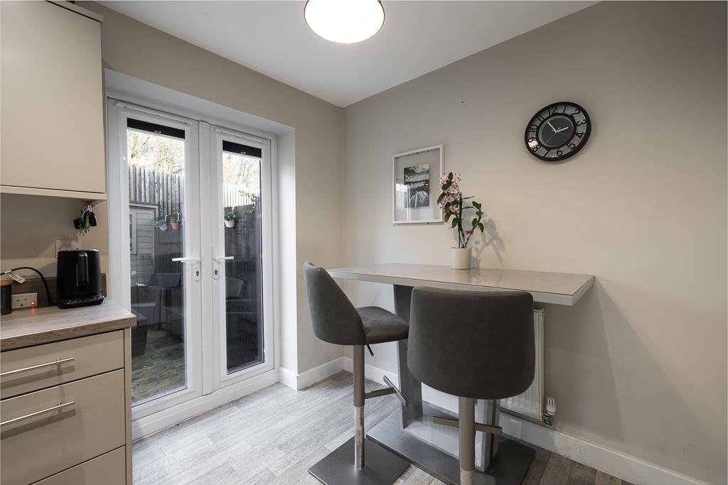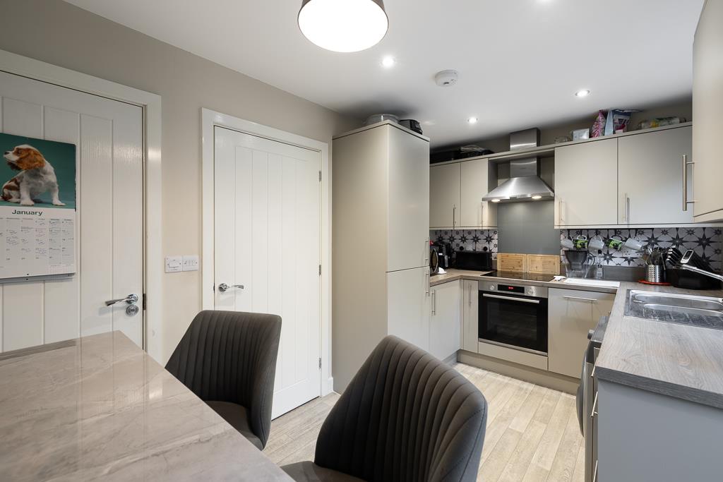 UPVC window and door to rear. Matching range of base and eye level units with work surfaces over. Sink unit with drainer and mixer tap over. Electric hob with extractor hood over. Built in electric oven. Built in fridge/freezer. Built in slimline dishwasher. Space and plumbing for washing machine. Radiator. Wood effect flooring.