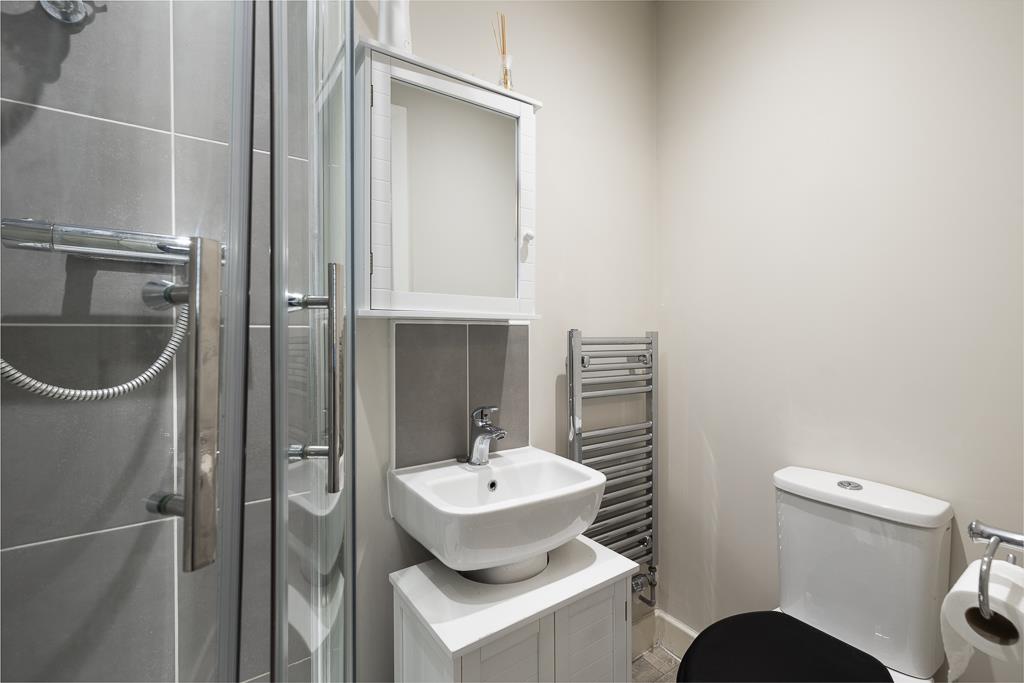 Shower cubicle. Toilet. Wash hand basin. Partially tiled walls. Wall mounted heated towel rail. Wood effect flooring.