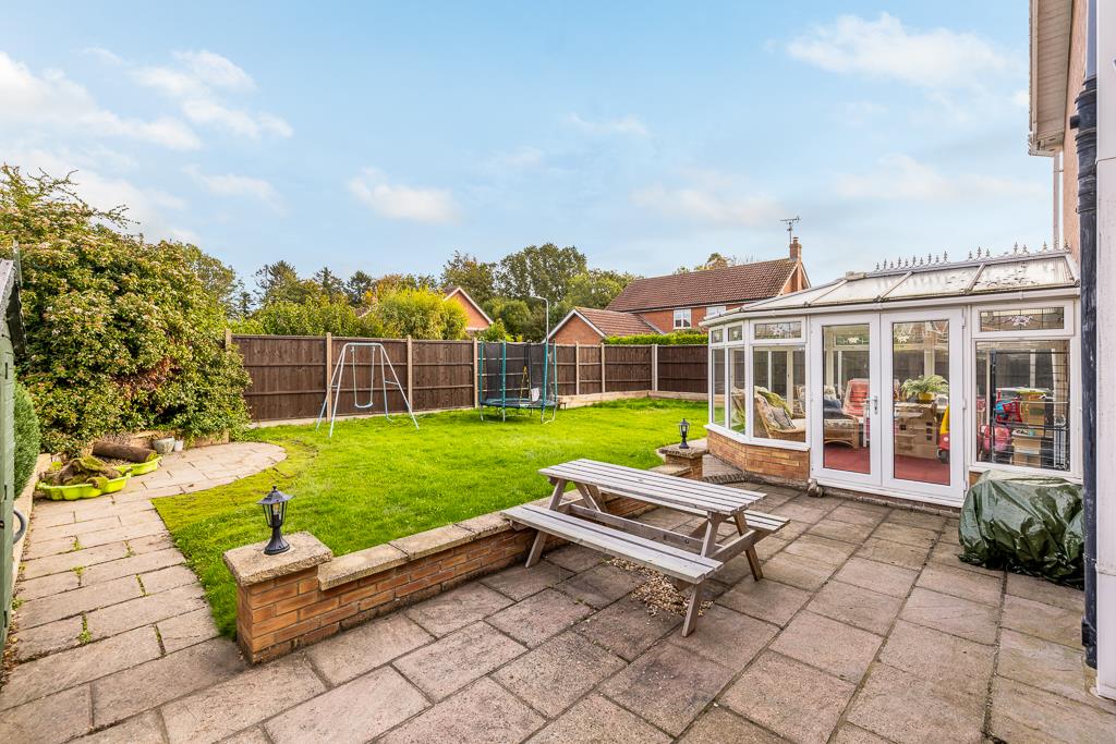 The rear garden is enclosed by timber fencing. Lawn area. Patio seating area.