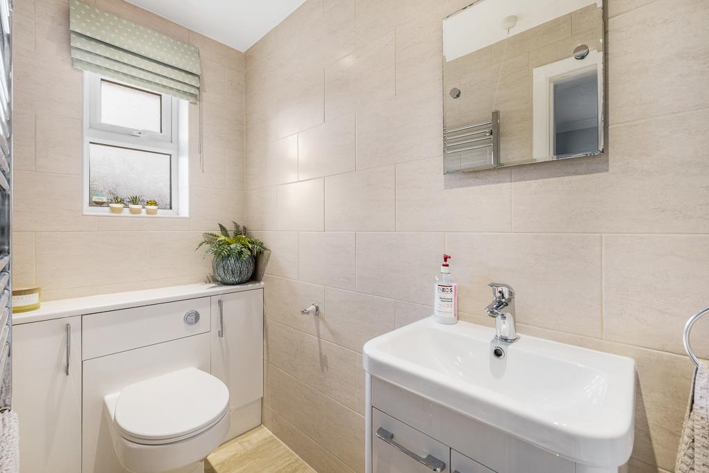 UPVC window to rear. Concealed cistern toilet and wash hand basin set in vanity unit. Bath with mixer tap over. Wall mounted heated towel rail. Vinyl flooring.