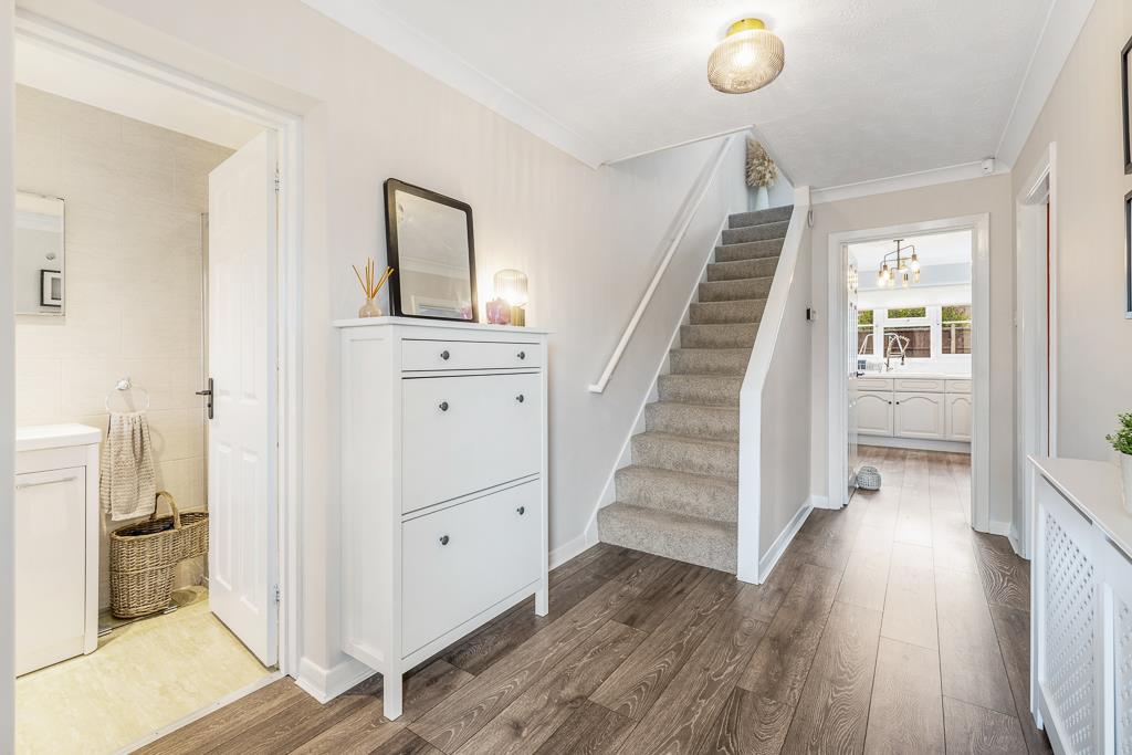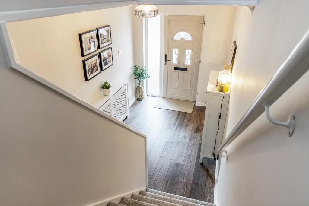 UPVC door to front with glazed side panel. Wood effect flooring. Radiator. Stairs to first floor landing.