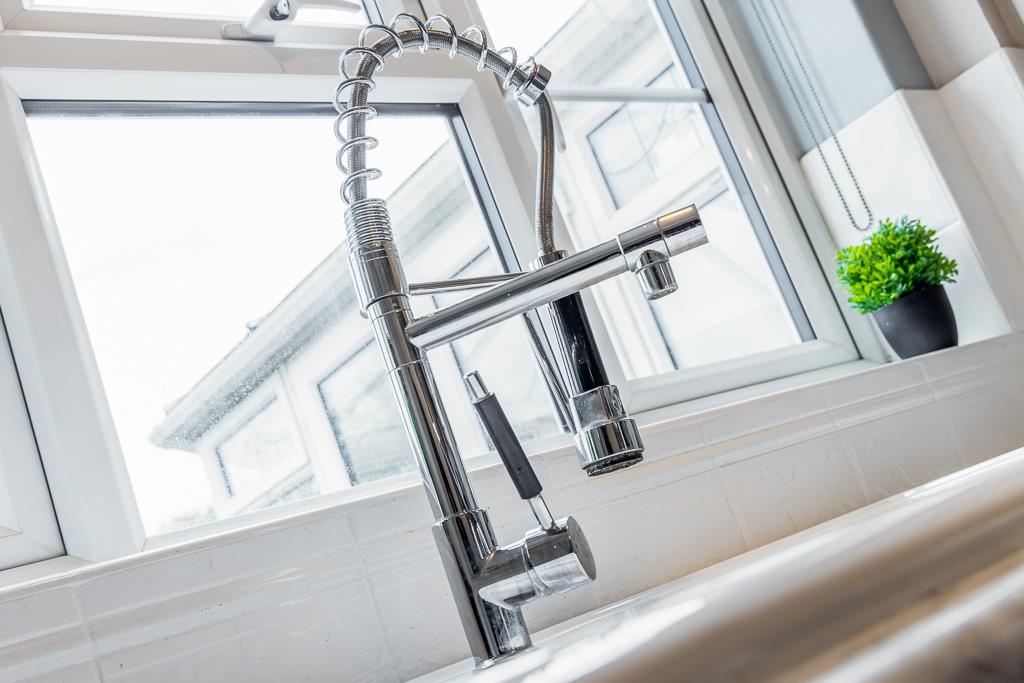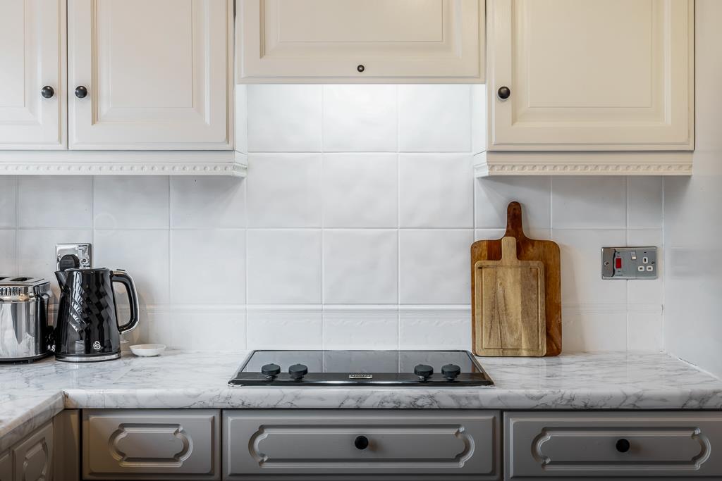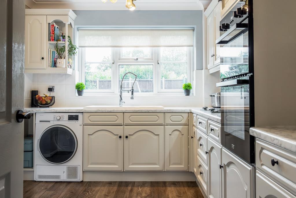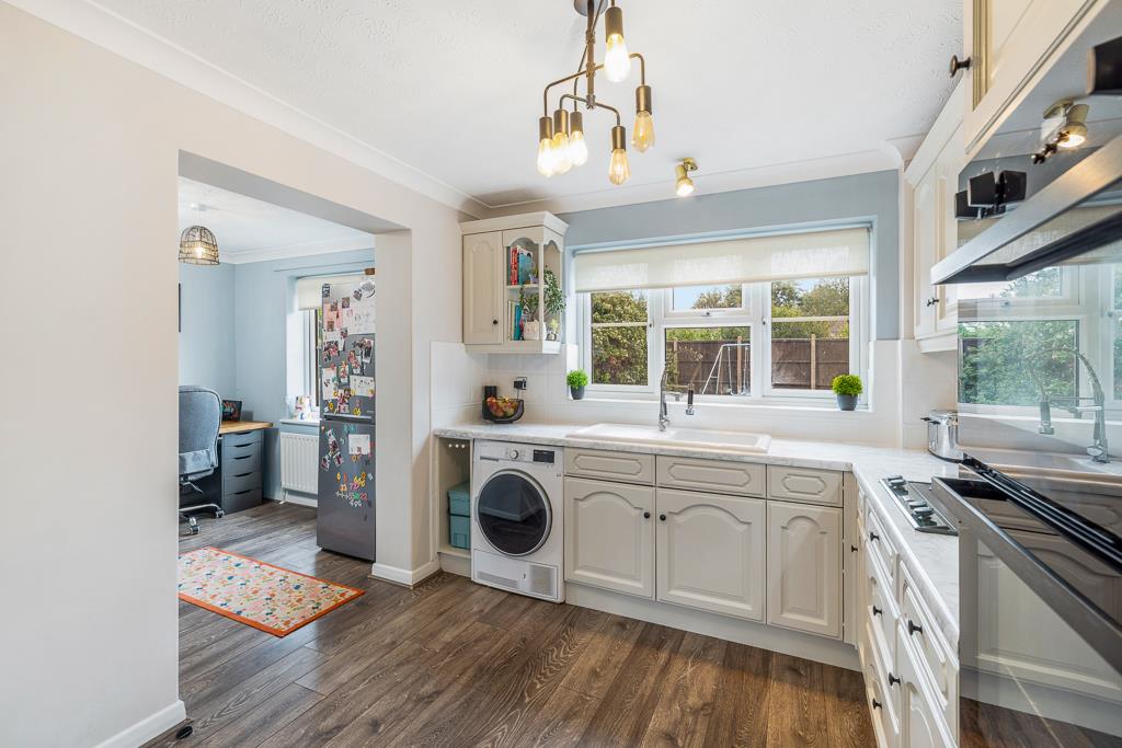UPVC door and window to side. Base and eye level units with work surface over. Space and plumbing for washing machine. Space for tumble dryer. Tiled effect flooring.
