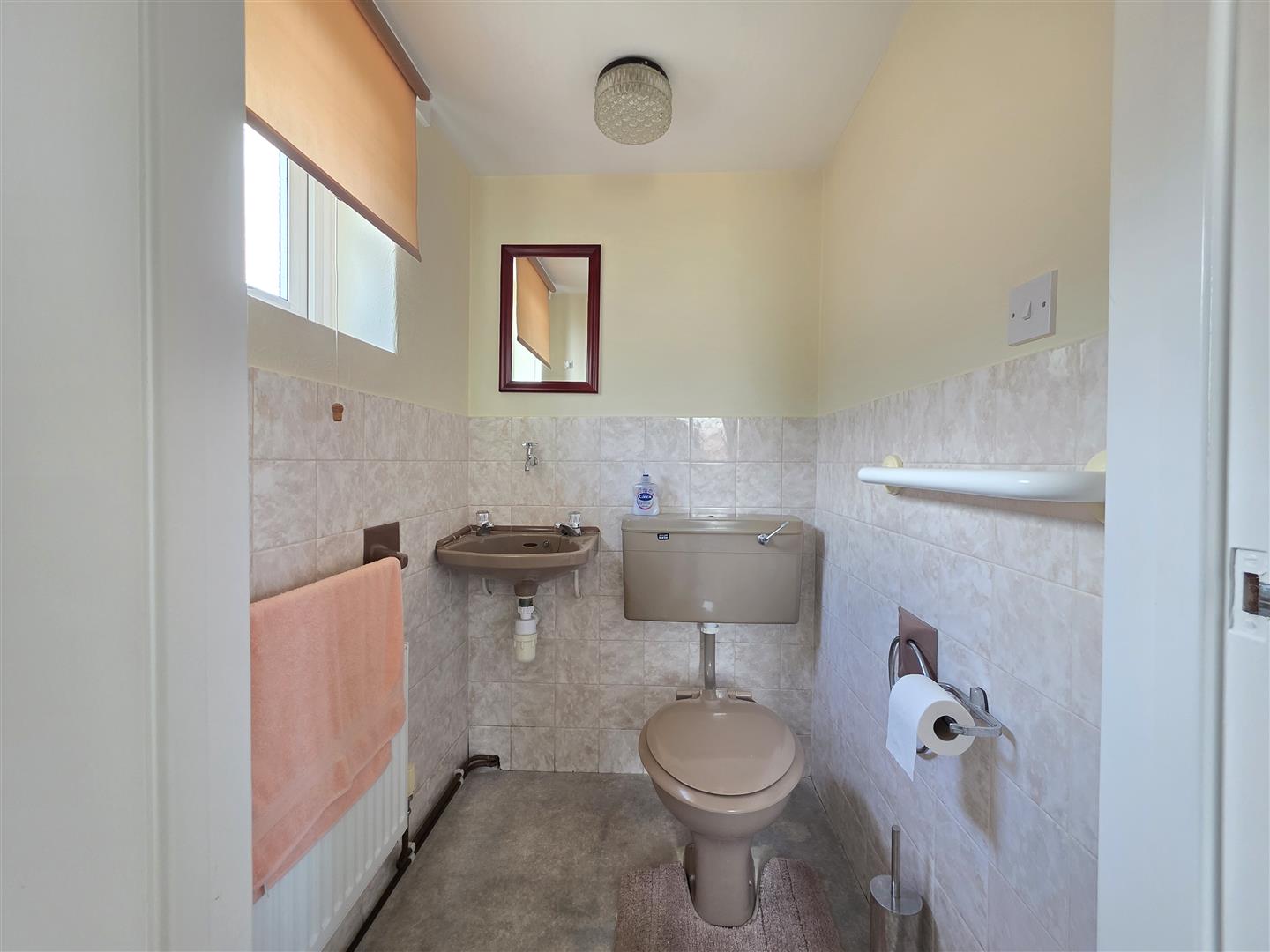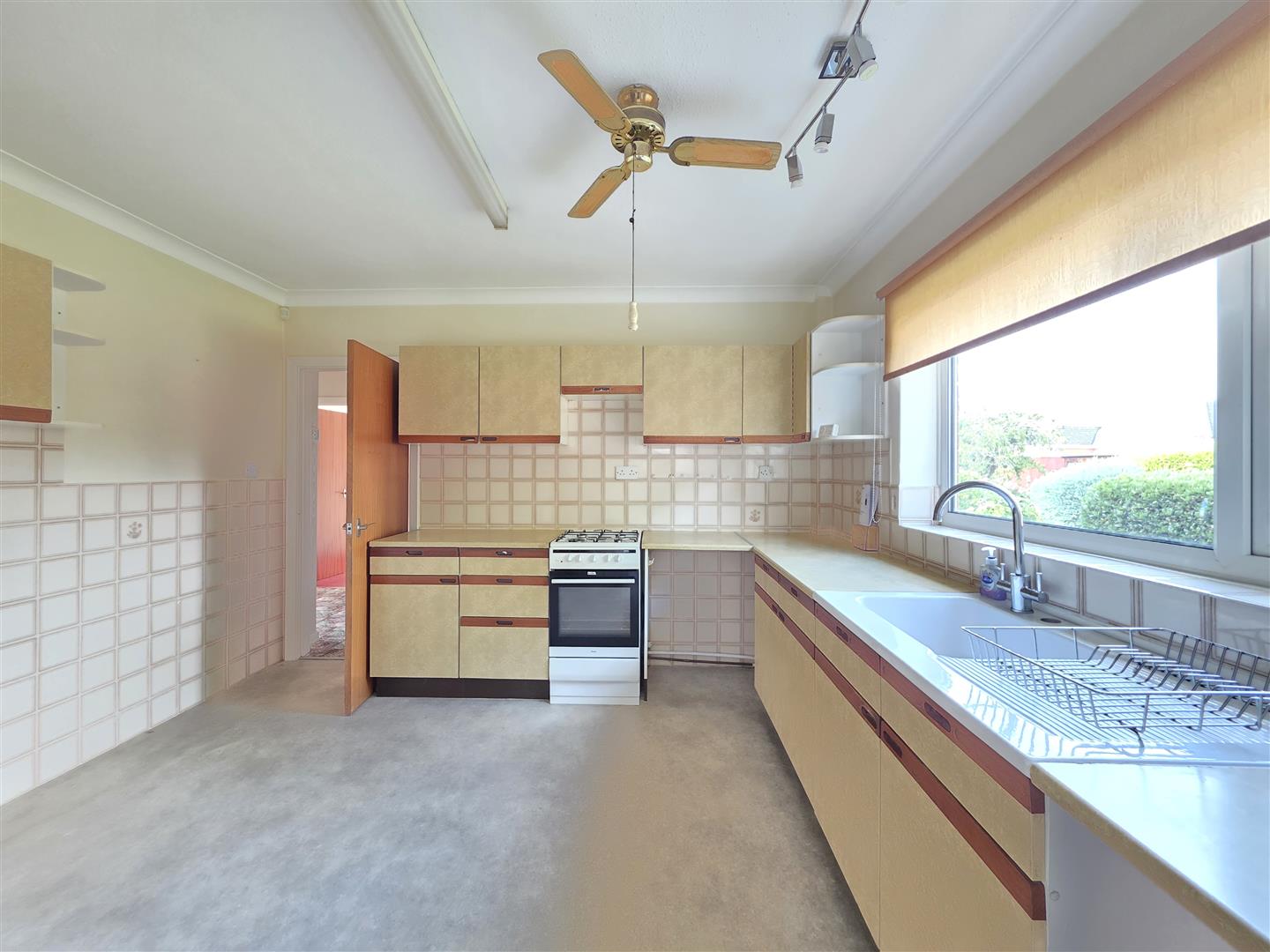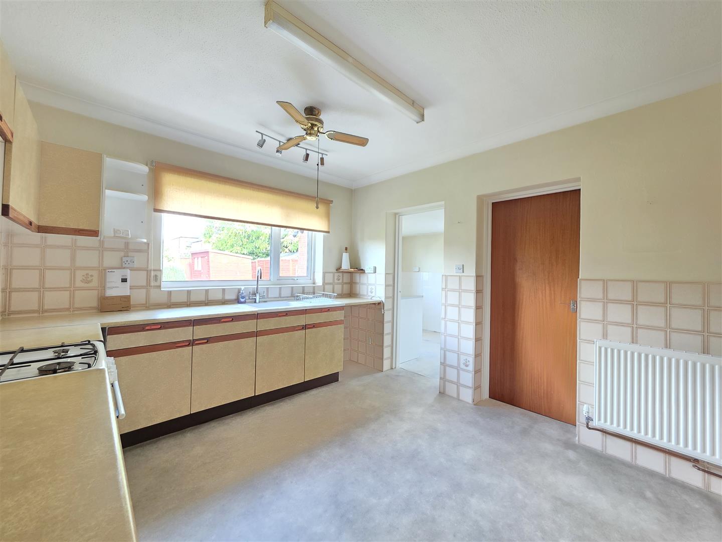 UPVC window to rear. Matching range of base and eye level units. Ceramic sink unit with mixer tap over. Space for oven. Space and plumbing for dishwasher. Space for fridge/freezer. Vinyl flooring. Partially tiled walls. Radiator. Pantry with shelving.