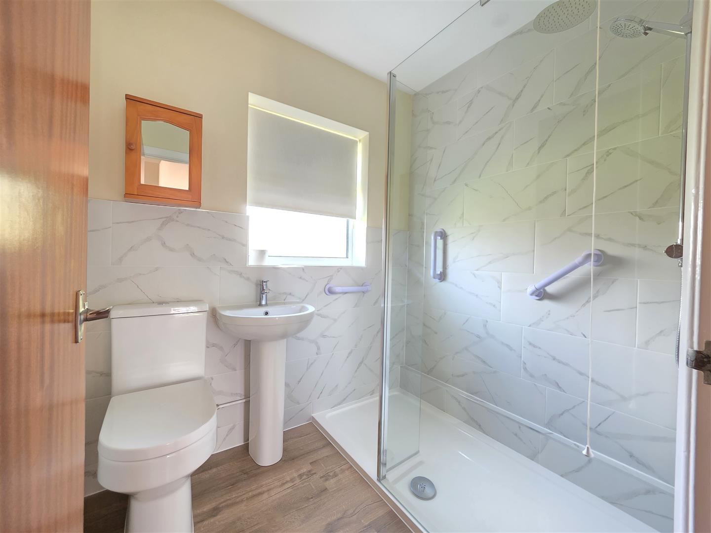 UPVC window to rear. Wood effect laminate flooring. Shower enclosure with rainwater head and separate shower extension over. Wash hand basin. Toilet. Partially tiled walls. Heated towel rail.