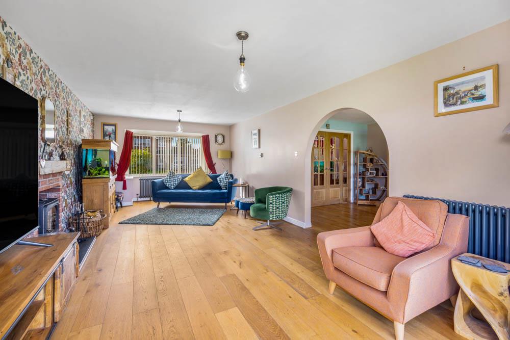 UPVC box bay window to front. Bi-fold doors to rear. Feature brick built fireplace with inset stove. Radiator. Engineered oak flooring.