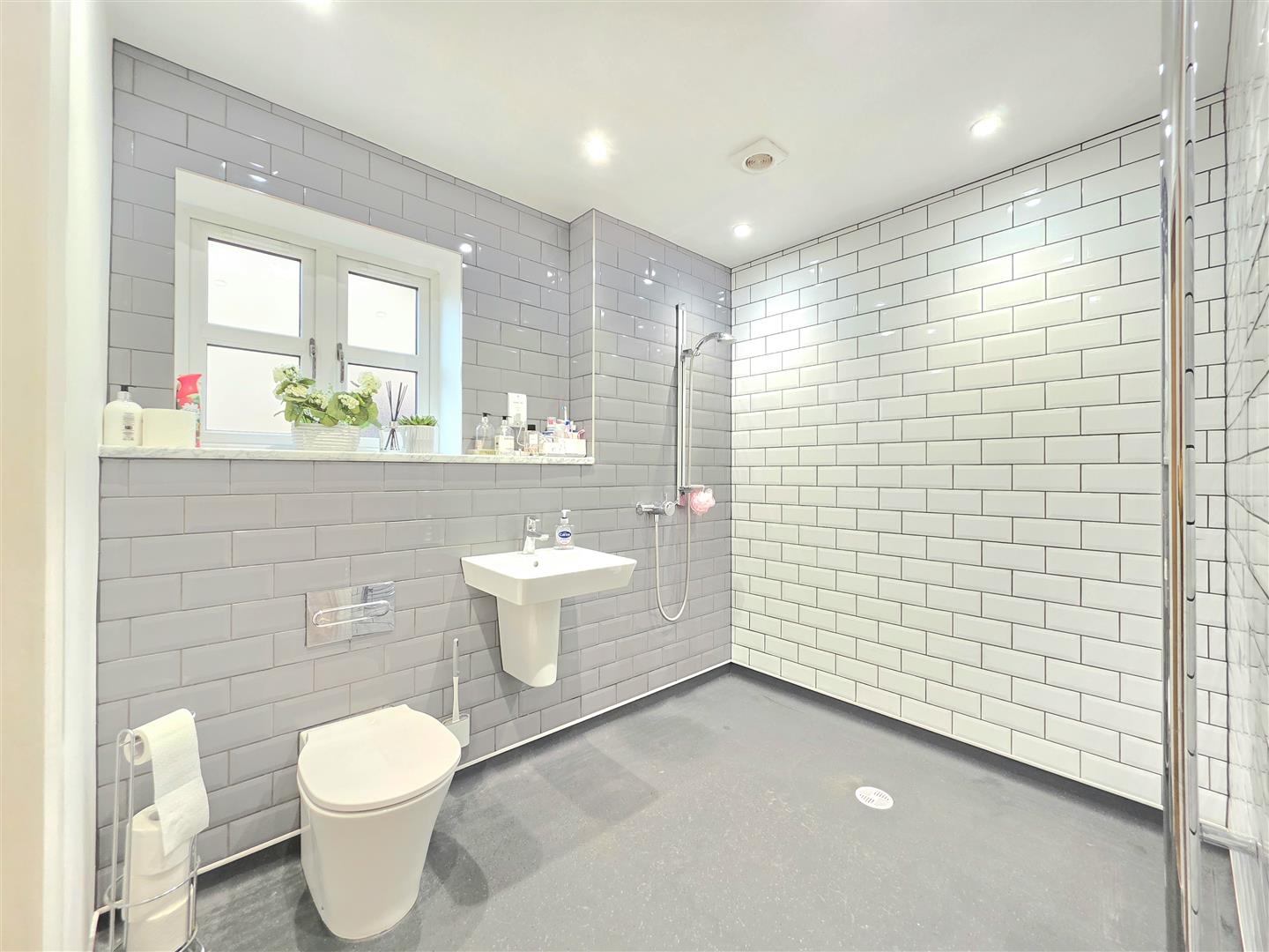 PVC double glazed window to side, wet room floor, metro tiled walls, extractor fan, fitted chrome thermostatic shower, wall mounted wash hand basin with chrome mixer tap over, concealed cistern toilet with push button flush.