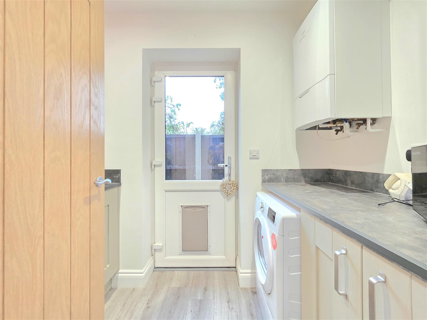 PVC double glazed door to side, LVT flooring, wall mounted mains gas central heating boiler, fitted base and wall units with worktop space and matching splashbacks, space and plumbing for washing machine.