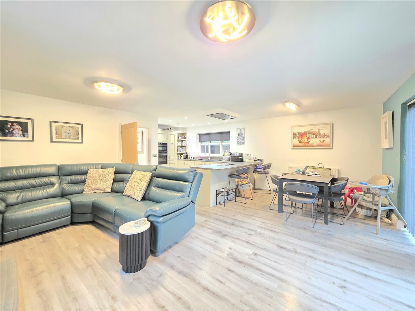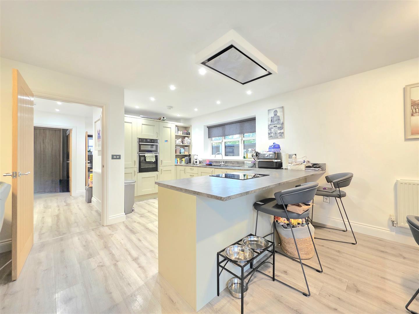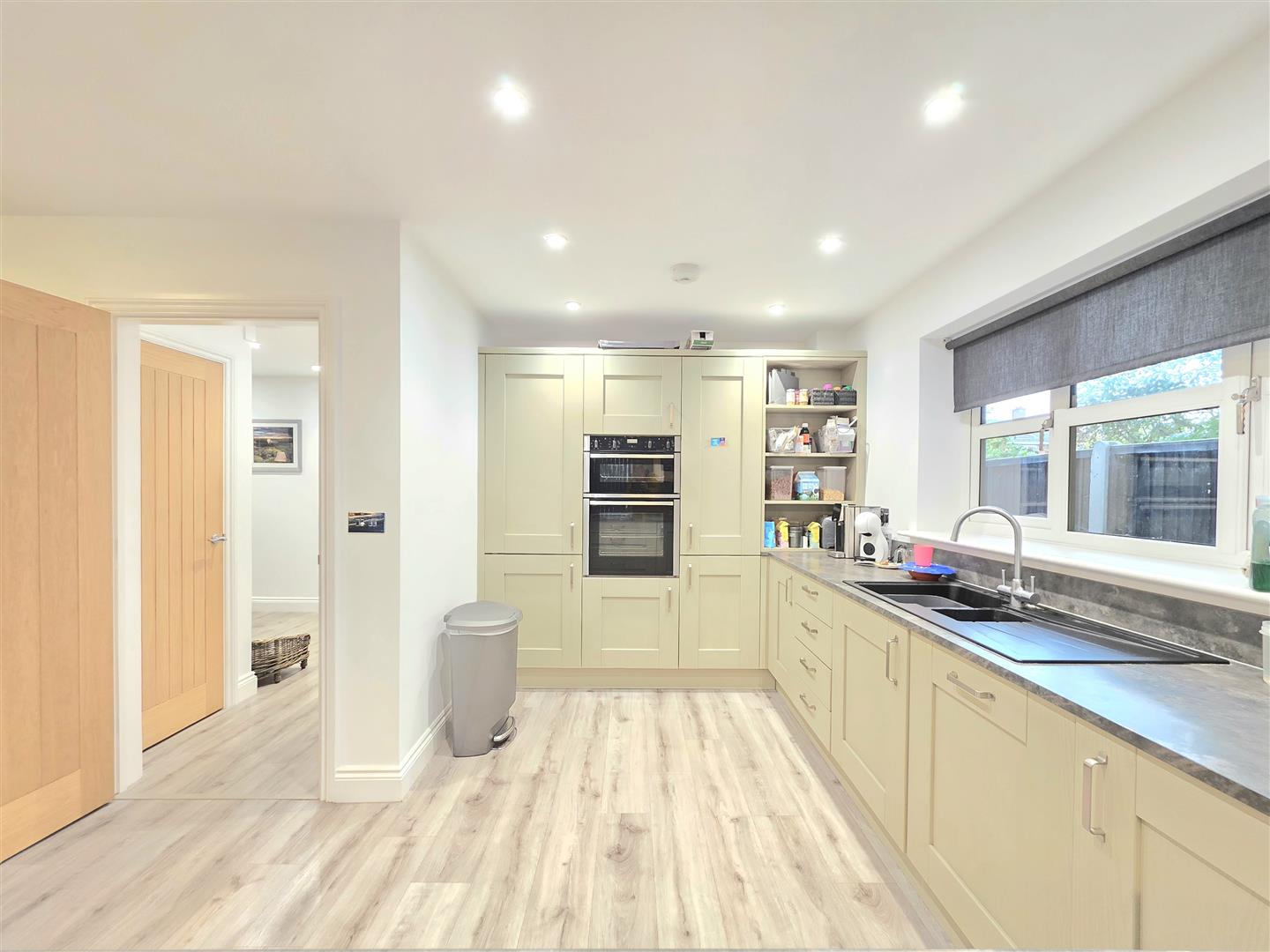 PVC double glazed windows to front and rear, French doors with glazed side panels to side opening to garden, LVT flooring, two radiators, feature media wall. Fitted base and eye level units with worktop space and breakfast peninsula. 1 1/2 bowl composite sink and drainer with mixer tap over, induction hob with ceiling mounted extractor hood, integrated dishwasher, integrated fridge and freezer, integrated oven and grill.