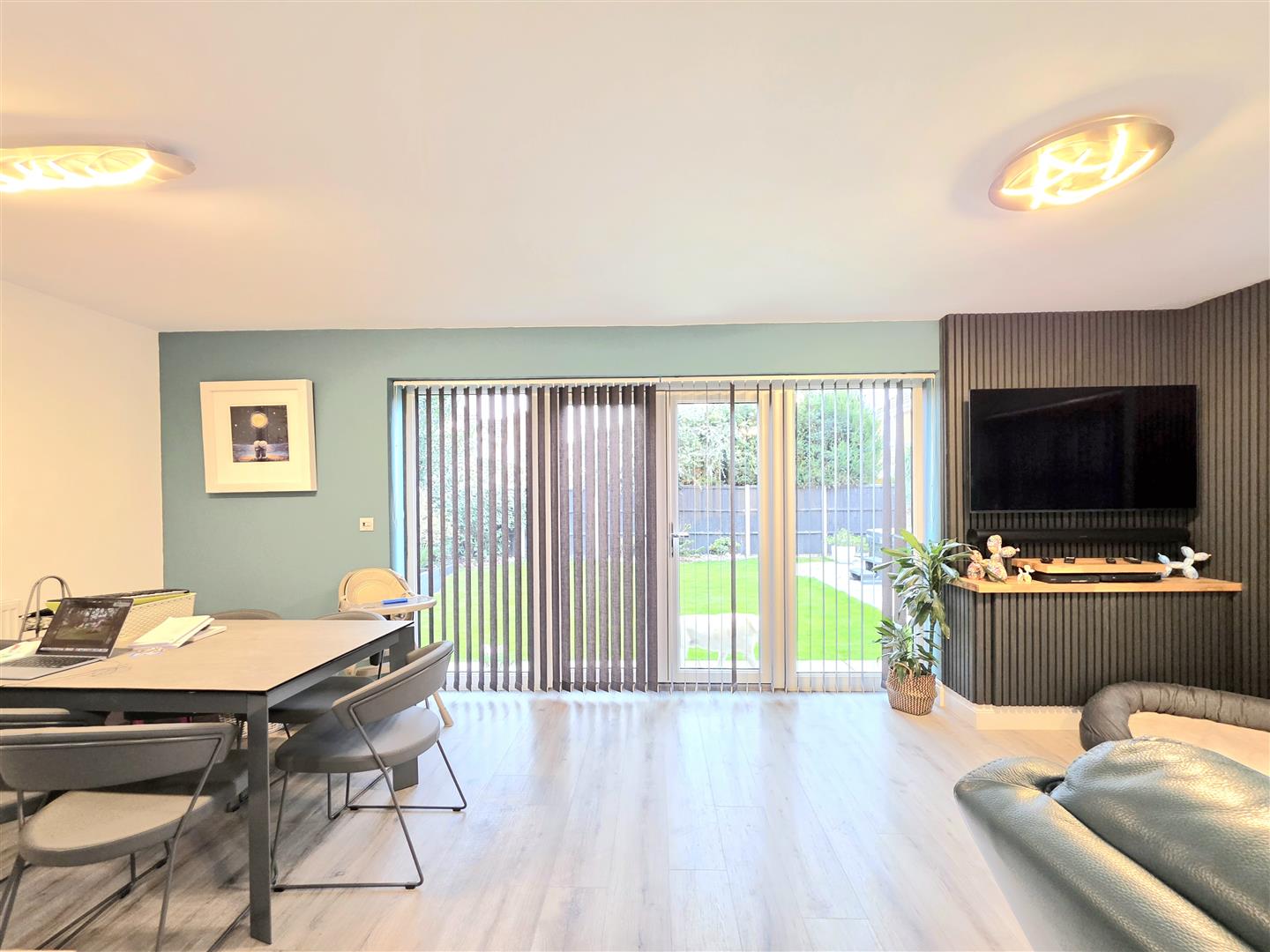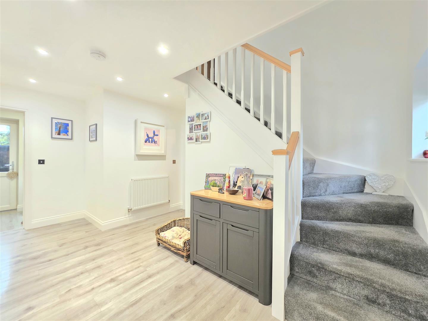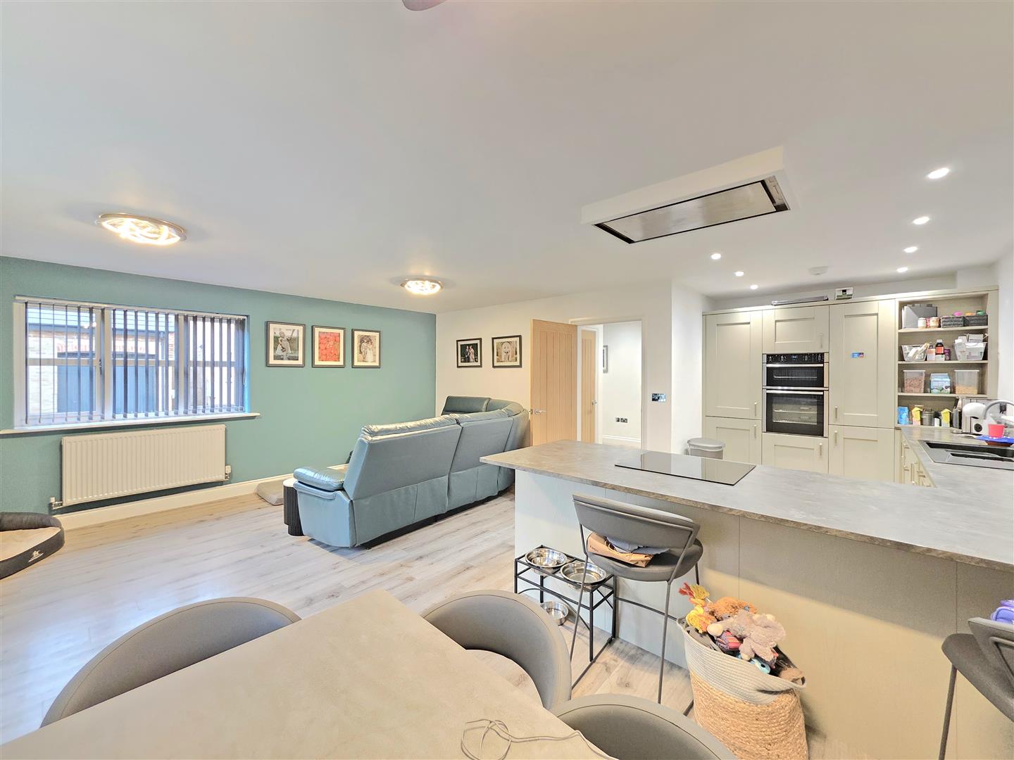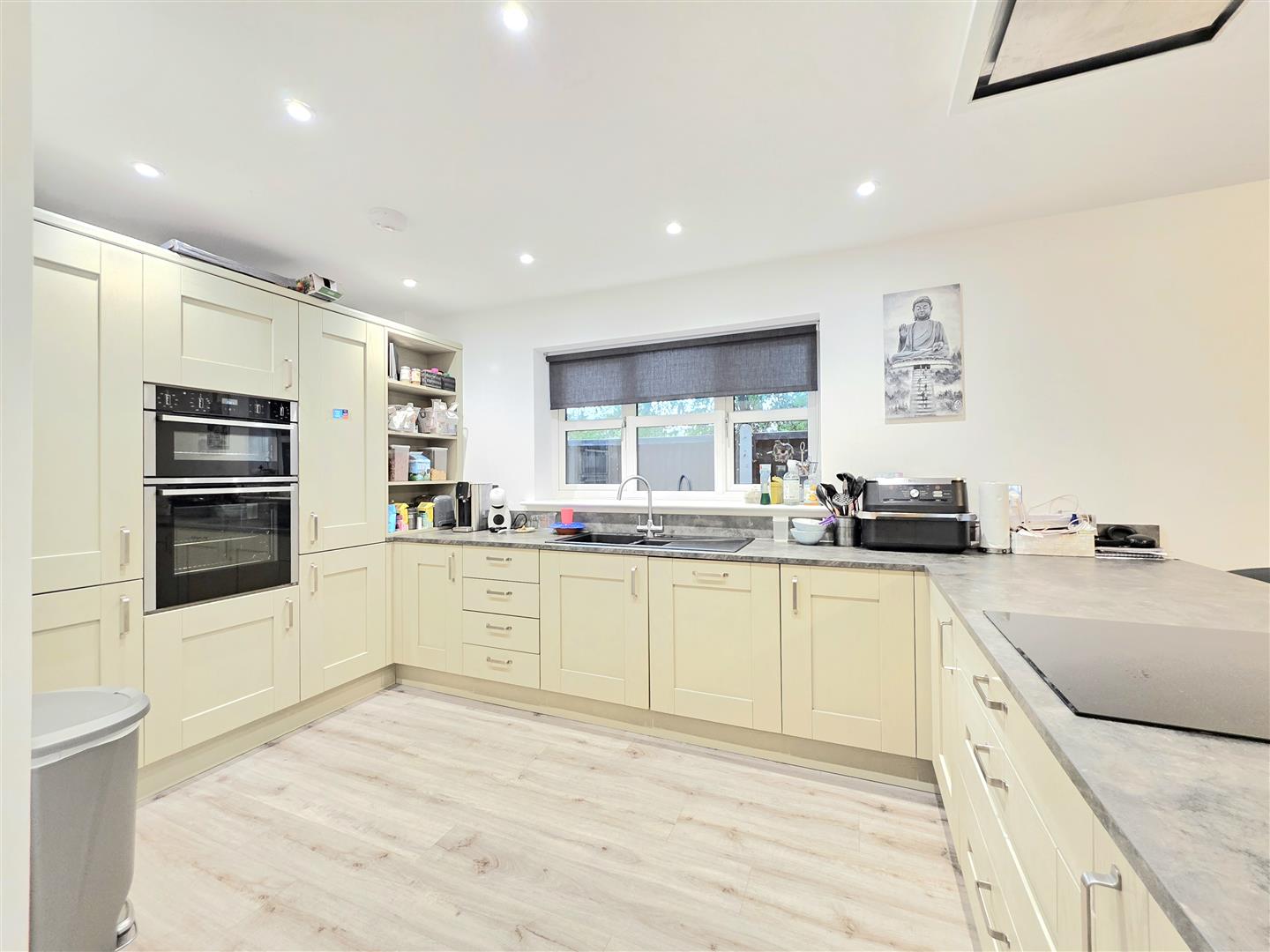 PVC double glazed windows to front and rear, French doors with glazed side panels to side opening to garden, LVT flooring, two radiators, feature media wall. Fitted base and eye level units with worktop space and breakfast peninsula. 1 1/2 bowl composite sink and drainer with mixer tap over, induction hob with ceiling mounted extractor hood, integrated dishwasher, integrated fridge and freezer, integrated oven and grill.