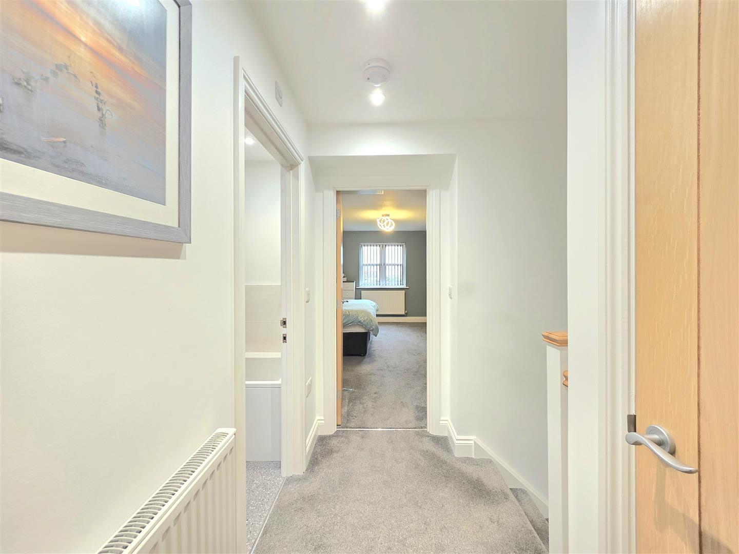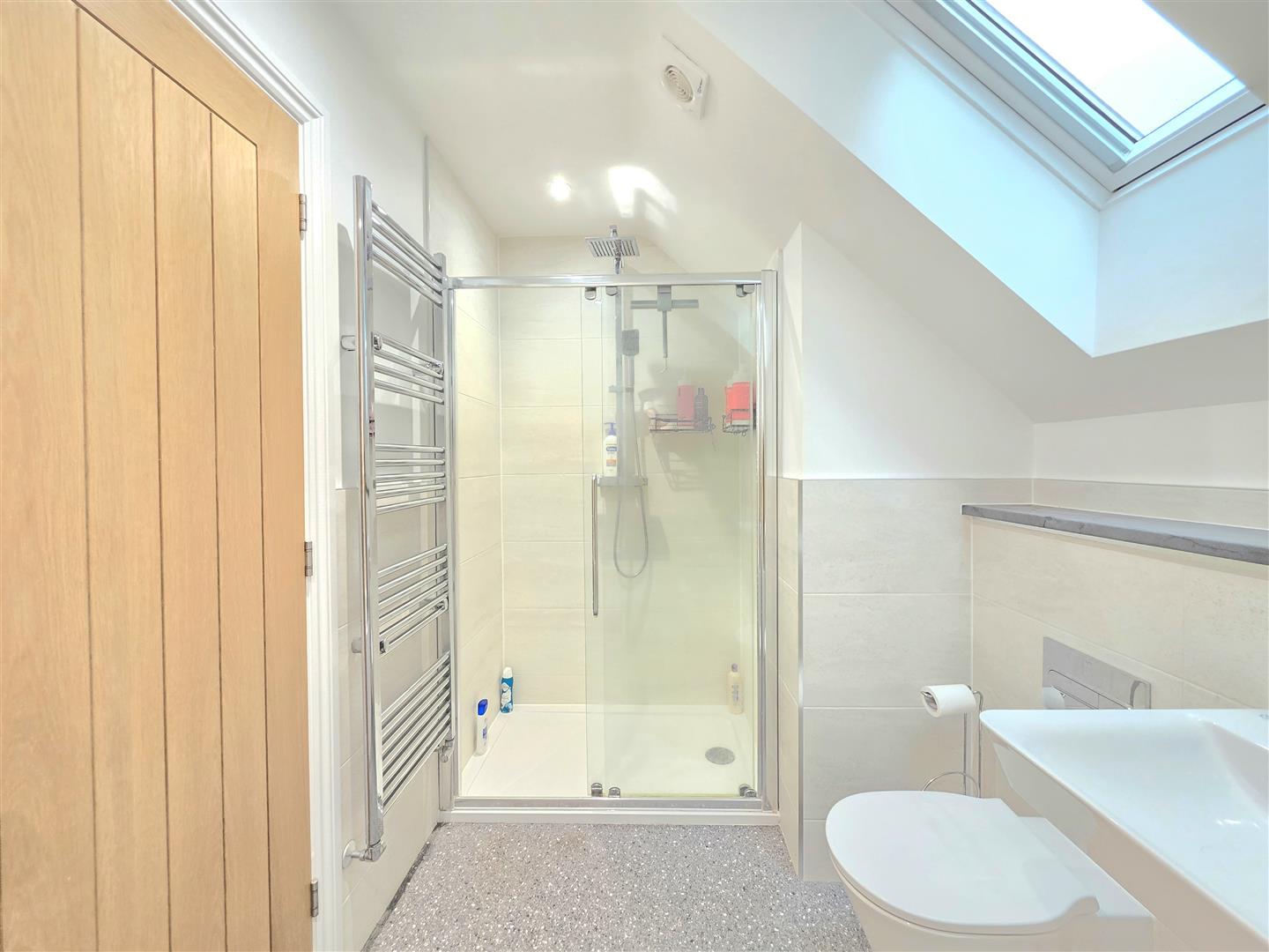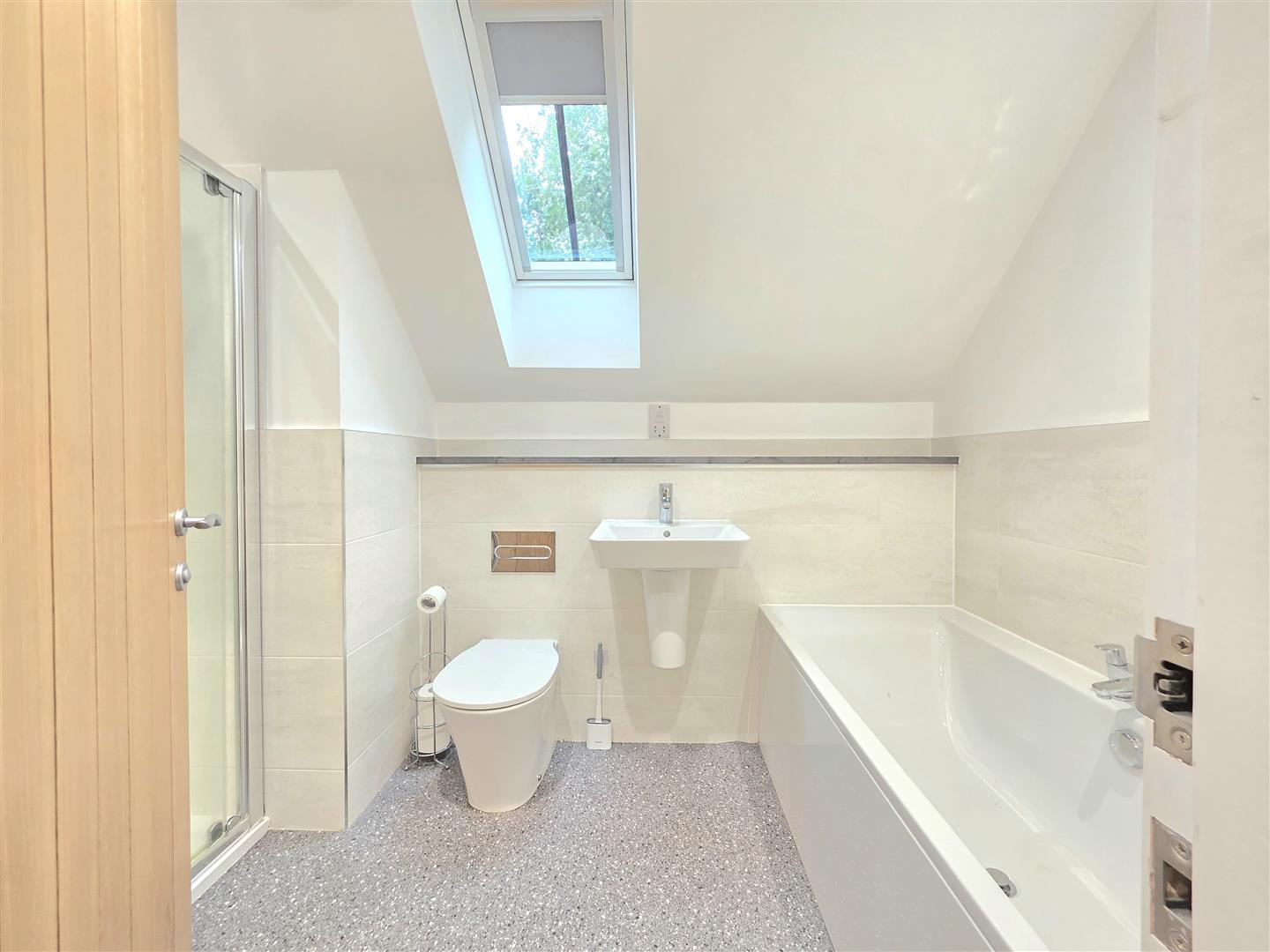 Velux style window to rear, vinyl flooring, extractor fan, shaver point. Fitted with a four piece suite comprising panel bath with chrome mixer tap over, wall mounted wash hand basin with chrome mixer tap over, concealed cistern toilet with push button flush and walk in shower enclosure.