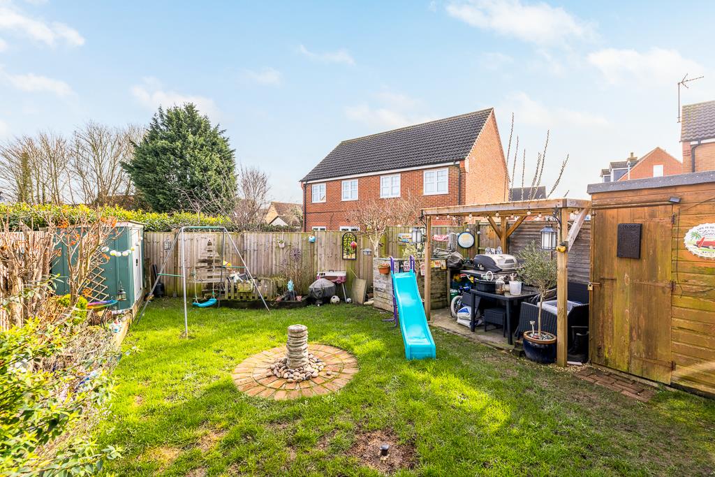 The rear garden is enclosed by timber fencing. Lawn area. Patio area.