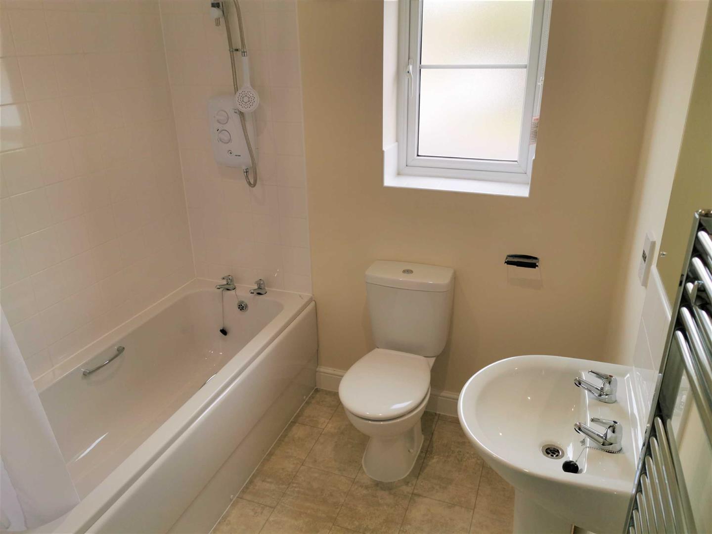 Three piece suite bathroom with WC unit, hand wash basin and bath unit with electric shower. Upvc window. Lino flooring. Skimmed walls and ceiling with tiled splashback.