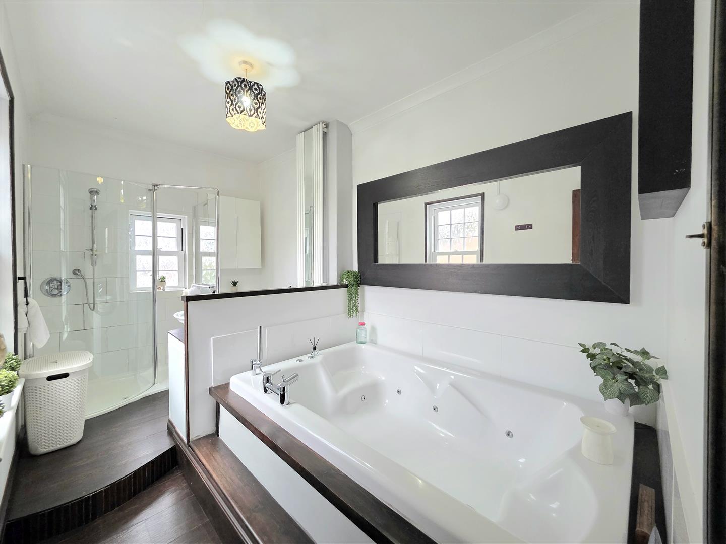 PVC Double glazed sliding sash windows to side and rear. Laminate flooring, vertical column towel radiator. Wall mounted mirrored vanity cabinet. Fitted with a four piece suite comprising oversize jacuzzi style bath, walk in shower enclosure, close coupled toilet with push button flush and wash hand basin set in vanity unit with built in storage.
