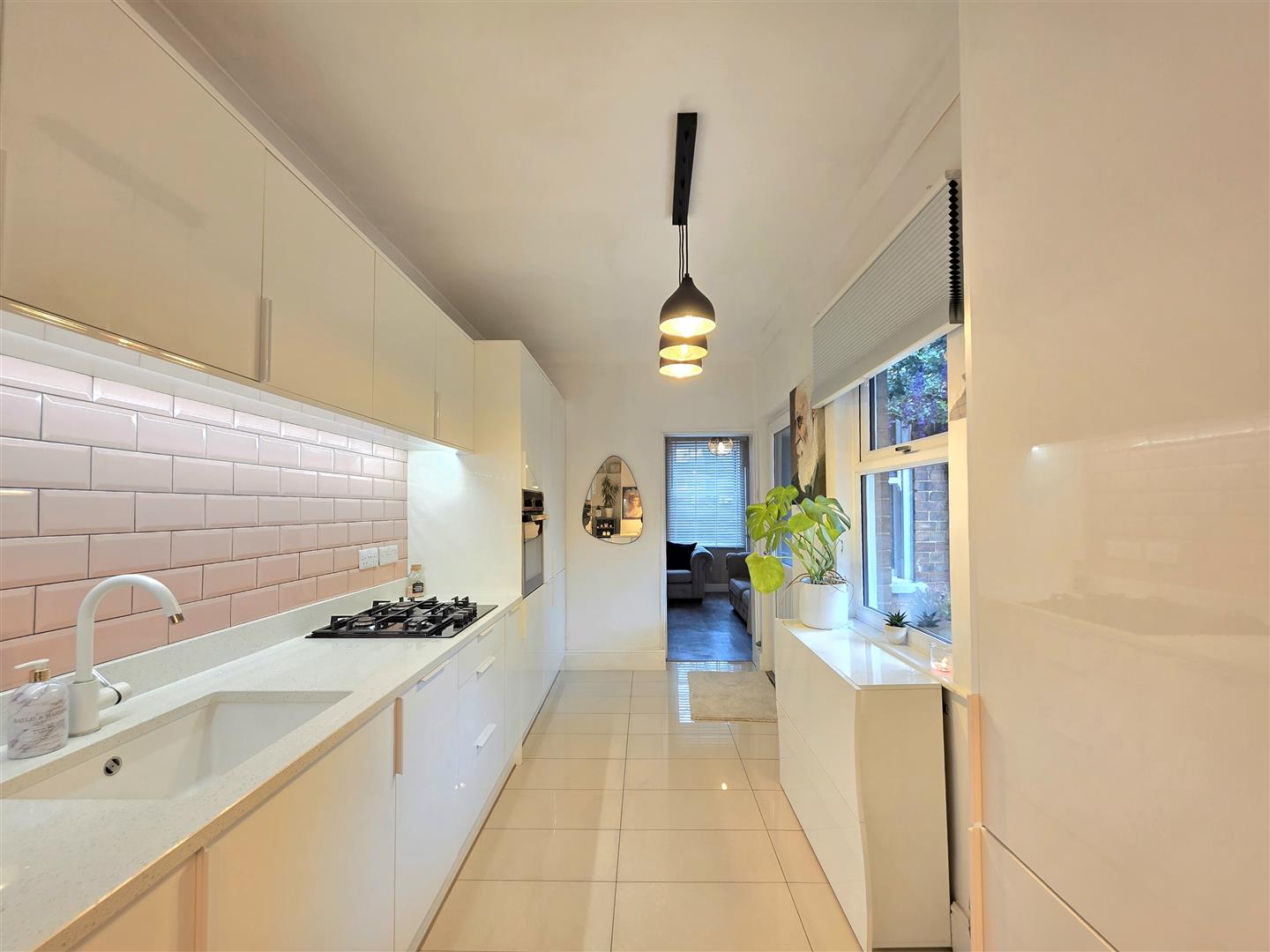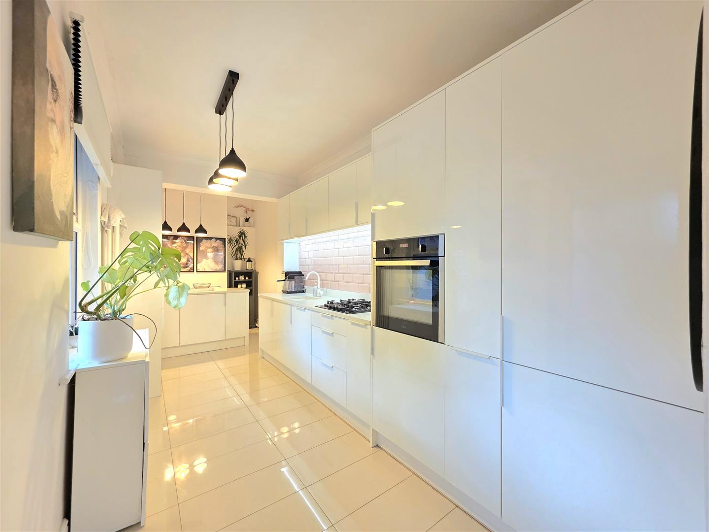 PVC double glazed window and door to side, tiled flooring. Fitted with a matching range of base and eye level units with quartz worktops and island seating unit. Tiled splashbacks. Four ring gas hob, integrated oven and grill, integrated dishwasher, integrated fridge freezer, inset sink with mixer tap over.