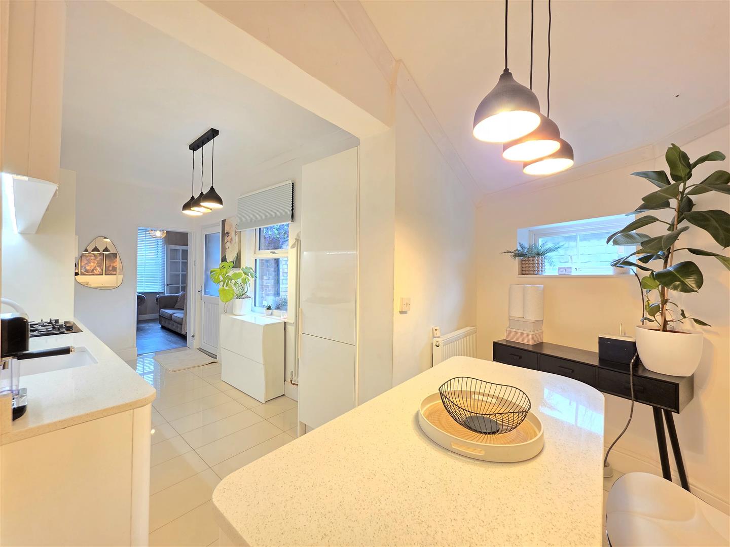 Stepping inside, the welcoming entrance hall leads into a cosy lounge full of warmth and personality. Adjacent is a versatile family/dining room, currently arranged as a third bedroom, providing fantastic flexibility to suit your needs. To the rear, the contemporary kitchen diner is a real highlight—beautifully styled with integrated appliances, an island unit, and plenty of space for cooking and gathering. A door opens directly onto the private courtyard, perfect for enjoying a morning coffee or evening drink.
