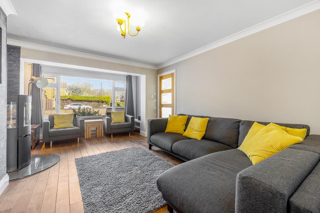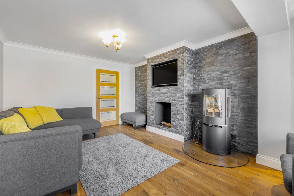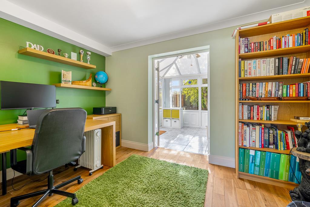 PVC double glazed window to front. Coving to skimmed ceiling. Solid wood flooring. Radiator. Cast iron log burner on glass hearth and chimney breast with recessed TV space. Door to office. French doors opening to conservatory.