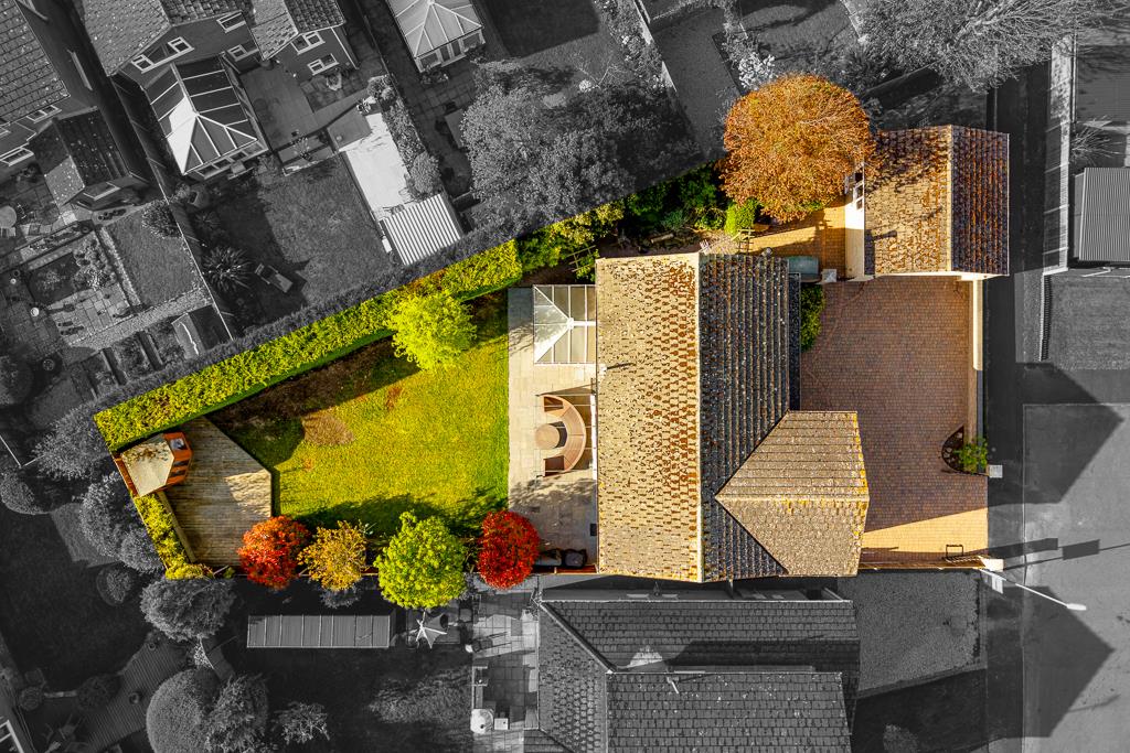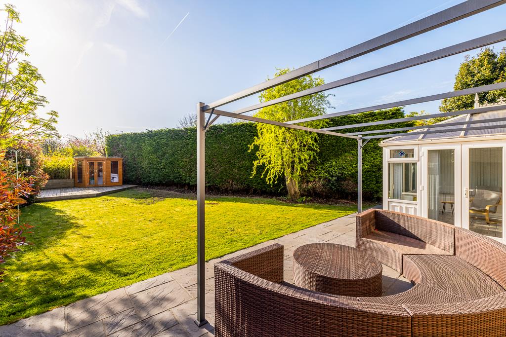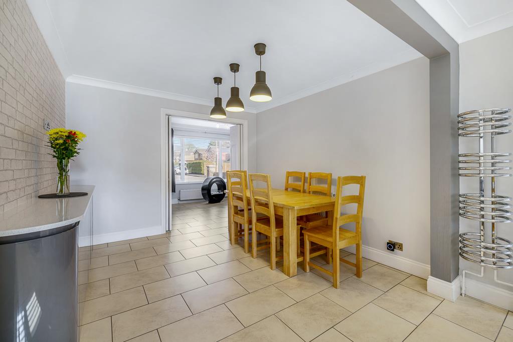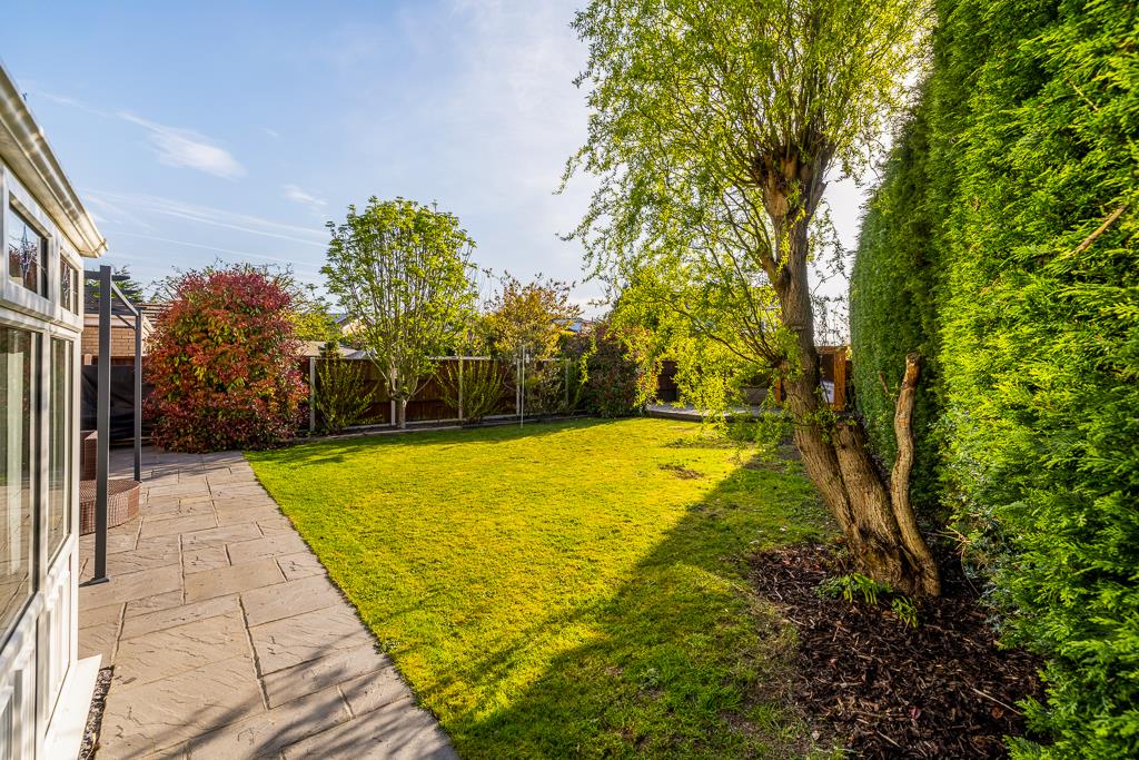 Occupying a generous plot, the home enjoys well-maintained gardens to the side and rear, providing excellent outdoor space. A detached oversized garage with an electric door further enhances the appeal.
