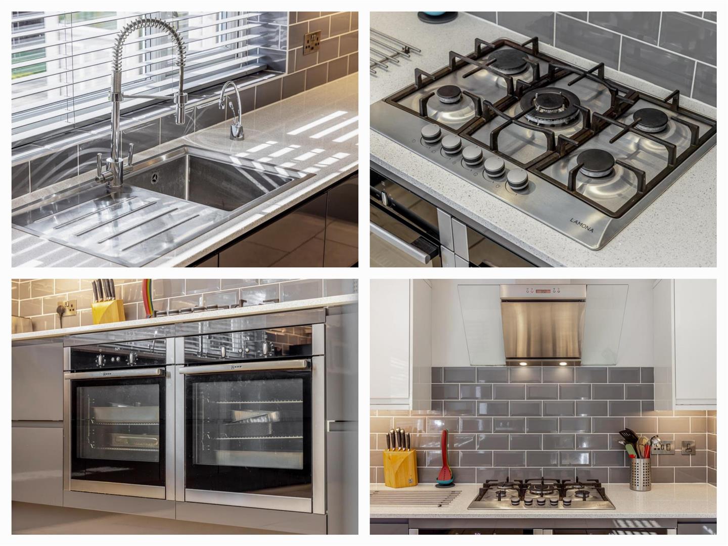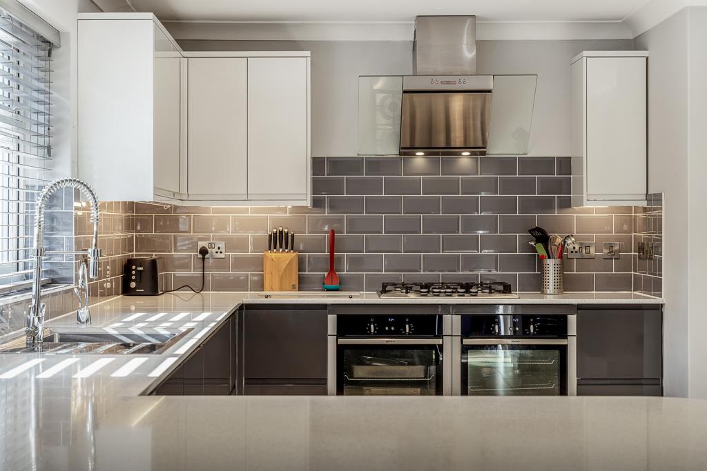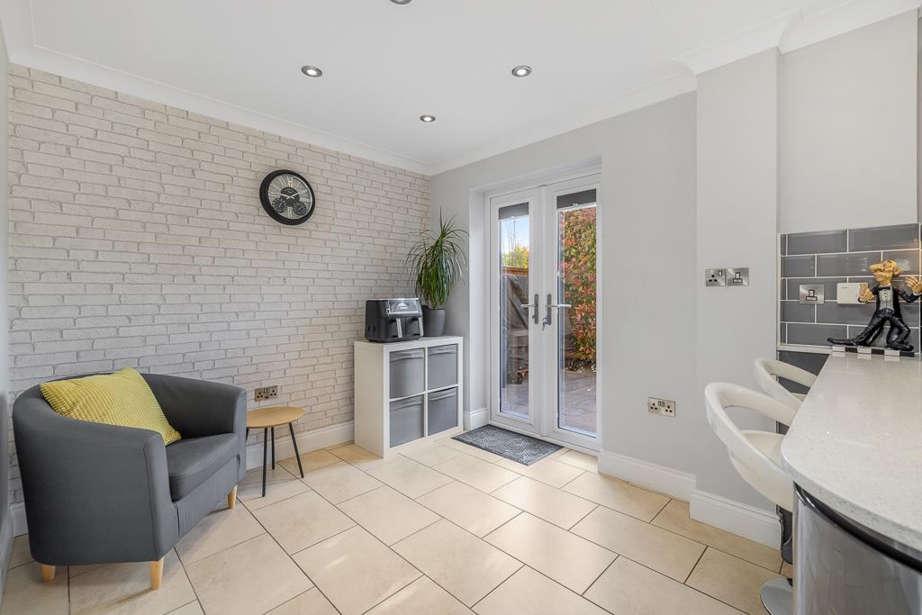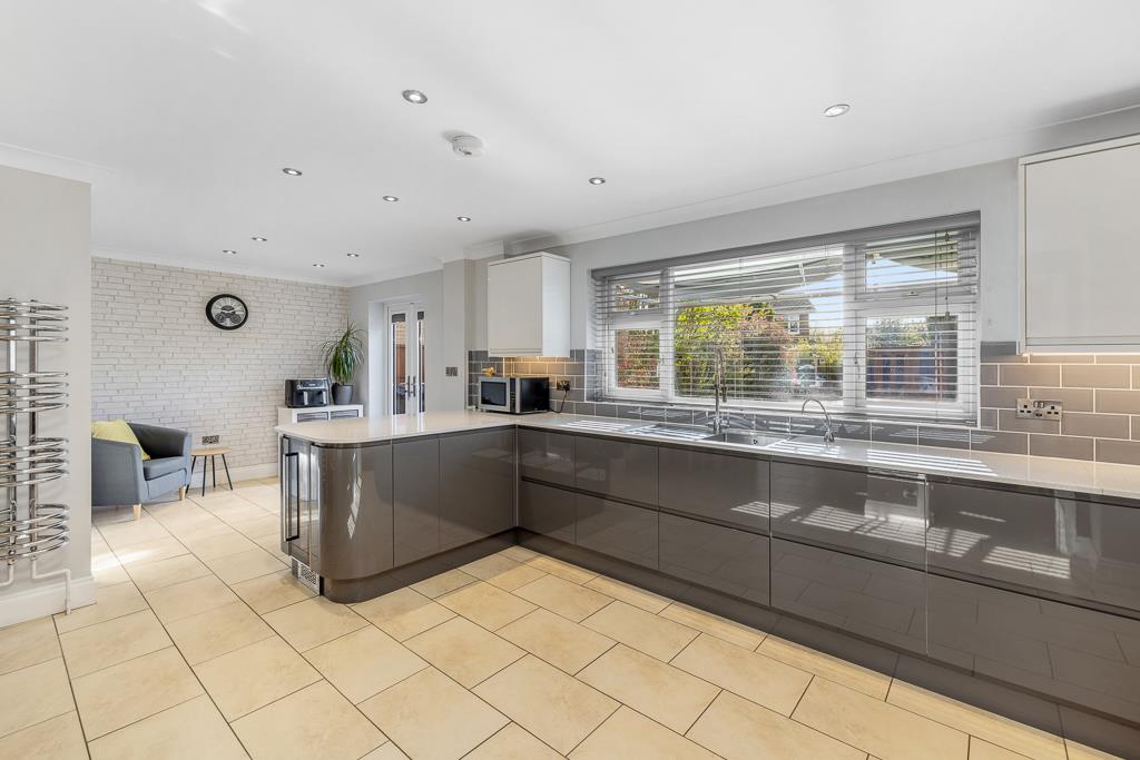 PVC double glazed window to rear. French doors to rear. Coving to skimmed ceiling. Recessed spot lighting to kitchen area. Tiled flooring. Chrome radiator. Fitted with a matching range of contrasting colour base and eye level units with quartz worktops and tiled splash backs. Five ring gas hob with stainless steel extractor hood over and twin Neff slide and hide ovens. Stainless steel sink drainer with chrome mixer tap and hot water tap. Integrated dishwasher. Integrated fridge. Integrated drinks chiller. Doors opening to family room and utility.