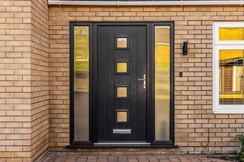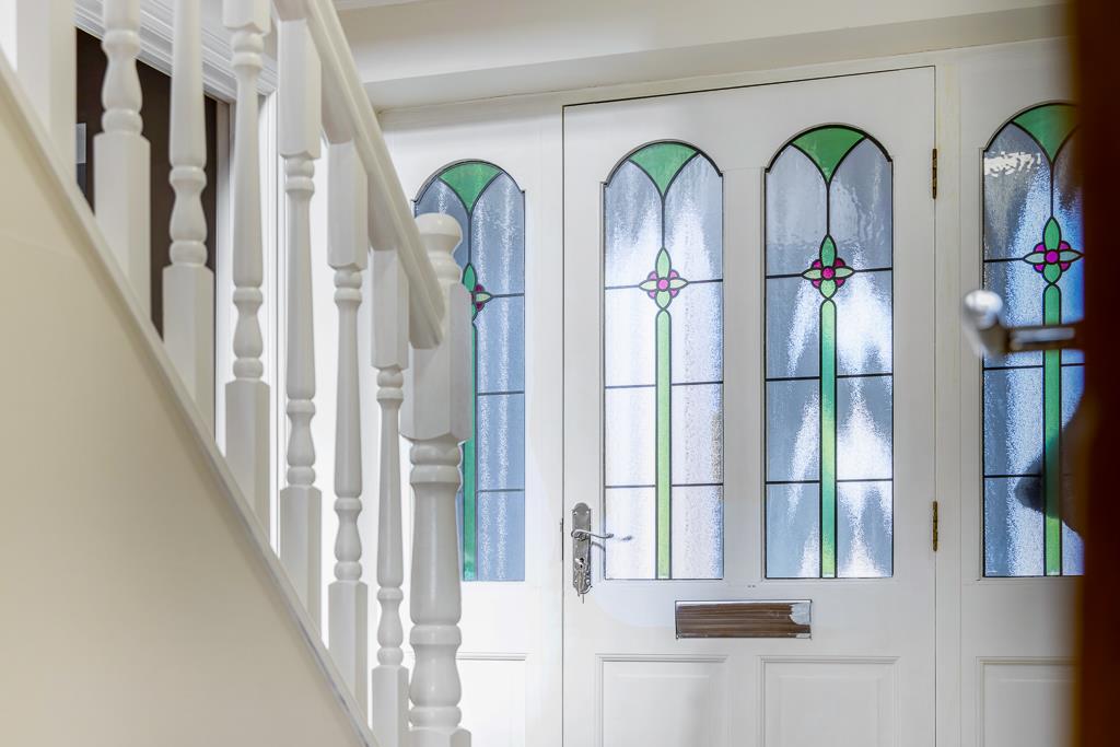Composite glazed entrance door with glazed side panels. Coving to skimmed ceiling. Tiled flooring. Built in shelving and hanging space. Door opening to hallway.