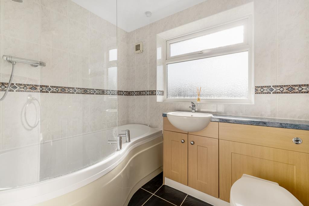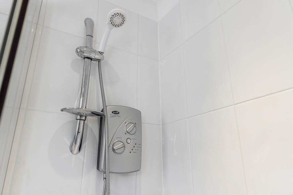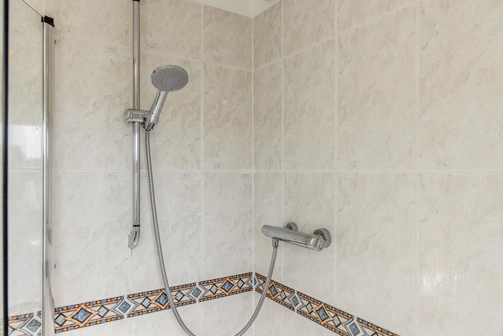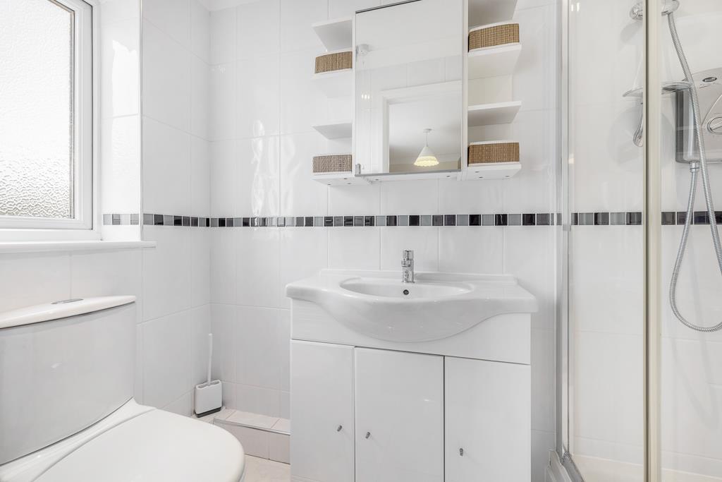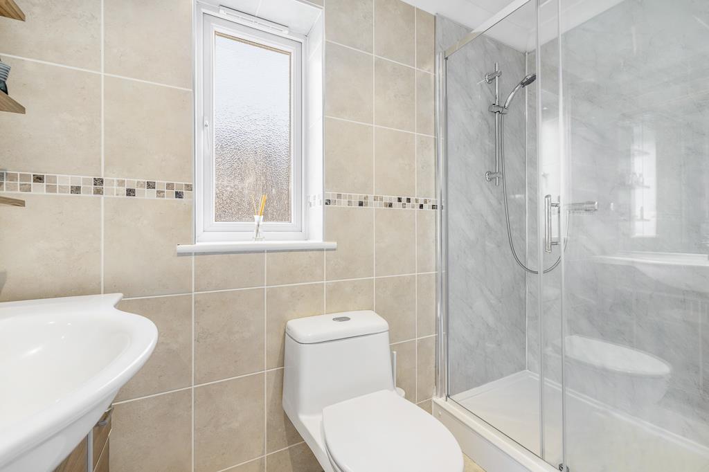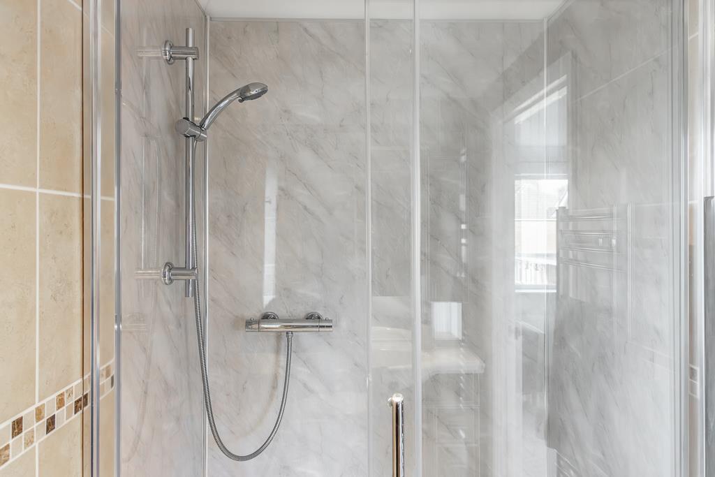PVC double glazed window to side. Coving to skimmed ceiling. Recessed spot lights. Extractor fan. Tiled flooring. Full height wall tiling. Chrome heated towel rail. Fitted three piece suite comprising shower enclosure with glass sliding door and thermostatic bar shower. Close coupled toilet with push button flush. Wash hand basin set in vanity unit with built in storage, courtesy light and shaver point.
