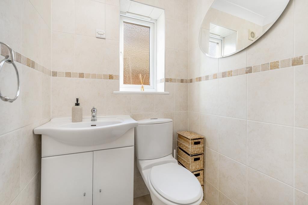 PVC double glazed window to side. Coving to skimmed ceiling. Tiled flooring. Full height wall tiling. Extractor fan. Fitted close coupled toilet with push button flush. Wash hand basin set in vanity unit with chrome mixer tap and built in storage.