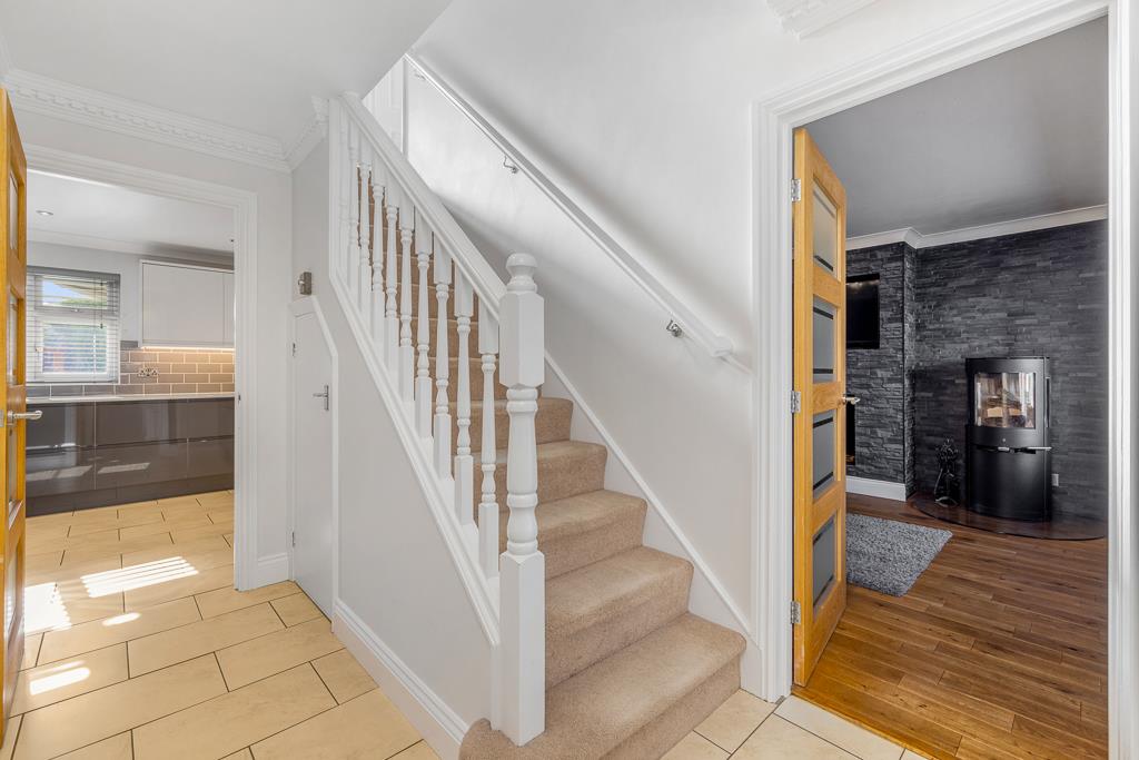 Coving to skimmed ceiling. Tiled flooring. Radiator. Stairs to first floor landing with built in understairs storage cupboard.