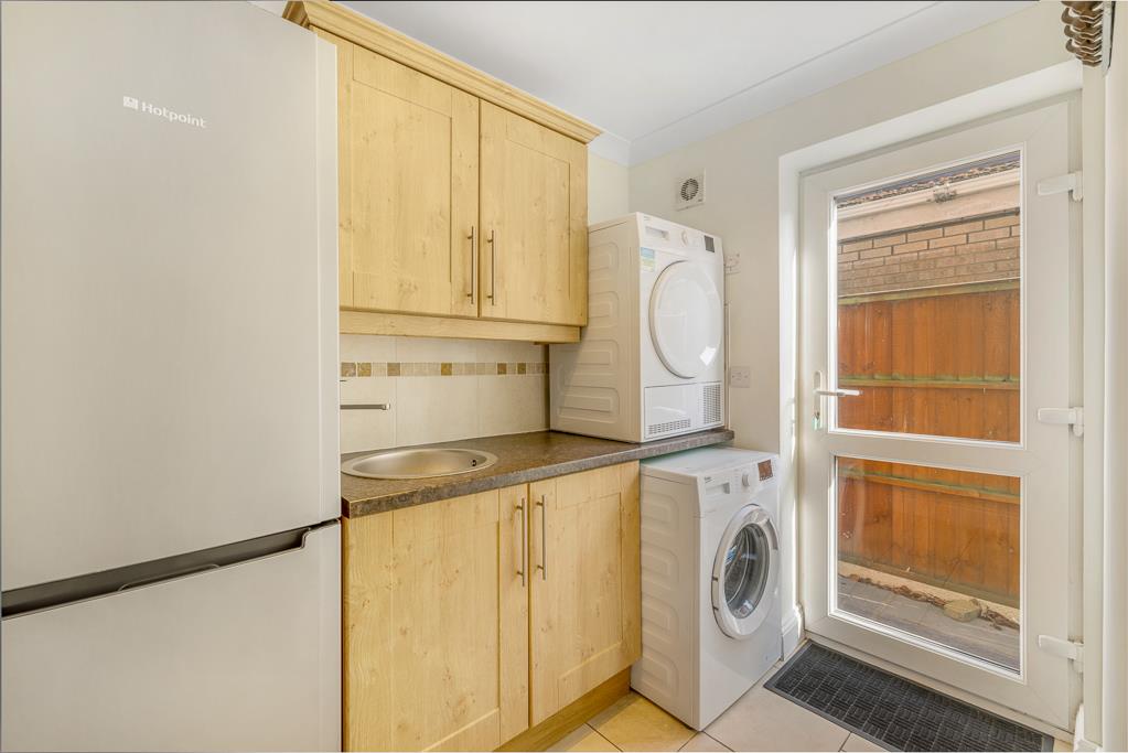 PVC double glazed door to side. Coving to skimmed ceiling. Extractor fan. Tiled flooring. Radiator. Fitted base and eye level units with work surface over and tiled splash back. Stainless steel sink with chrome mixer tap. Space for fridge/freezer. Space and plumbing for washing machine and tumble dryer. Door to cloakroom.