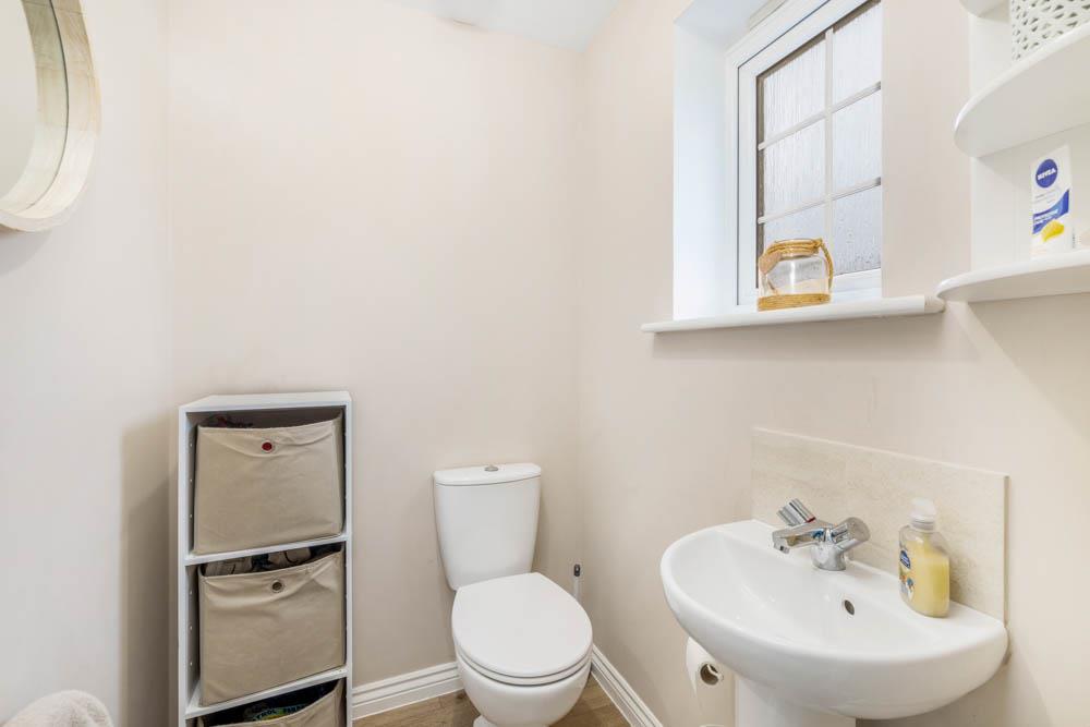 Three piece suite comprising of a panelled bath with shower over. Wash hand basin. Toilet. Partially tiled. Laminate flooring. Extractor fan.