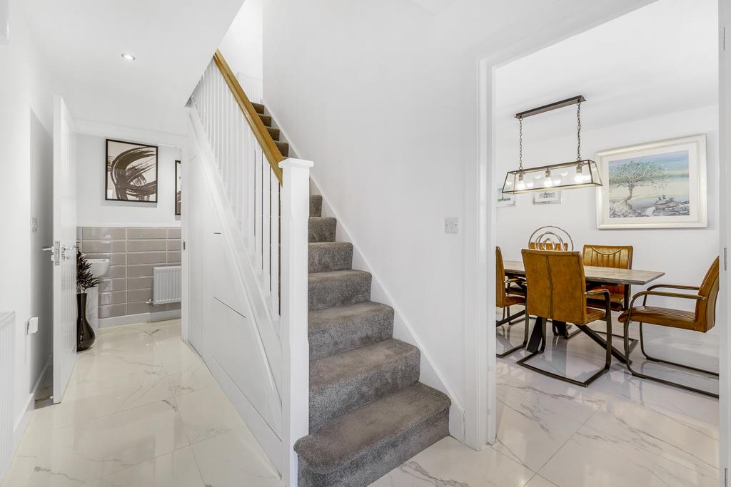 Composite glazed entrance door to front with glazed side pane. Skimmed ceiling. Recessed spot lighting. Stairs to first floor landing. Bespoke built in under stairs storage. Tiled flooring. Radiator. Doors to lounge, cloakroom and kitchen.