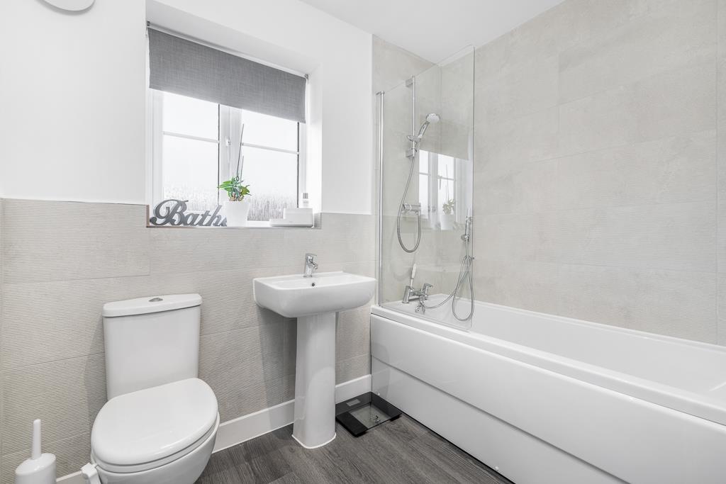 PVC double glazed window to rear. Skimmed ceiling. Recessed spot lighting. Extractor fan. LVT flooring. Shaver point. Chrome heated towel rail. Fitted panel bath with chrome mixer tap and shower attachment, chrome thermostatic bar shower over and glass screen. Pedestal wash hand basin with chrome mixer tap over. Close coupled toilet with push button flush.