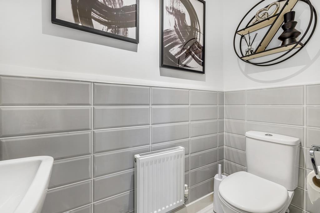 Skimmed ceiling. Recessed spot lighting. Extractor fan. Tiled floor. Half height wall tiling. Radiator. Fitted close coupled toilet with push button flush. Pedestal wash hand basin with chrome mixer tap.