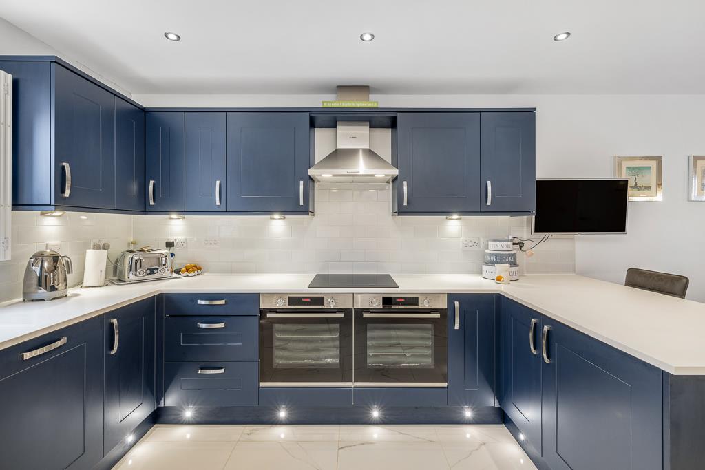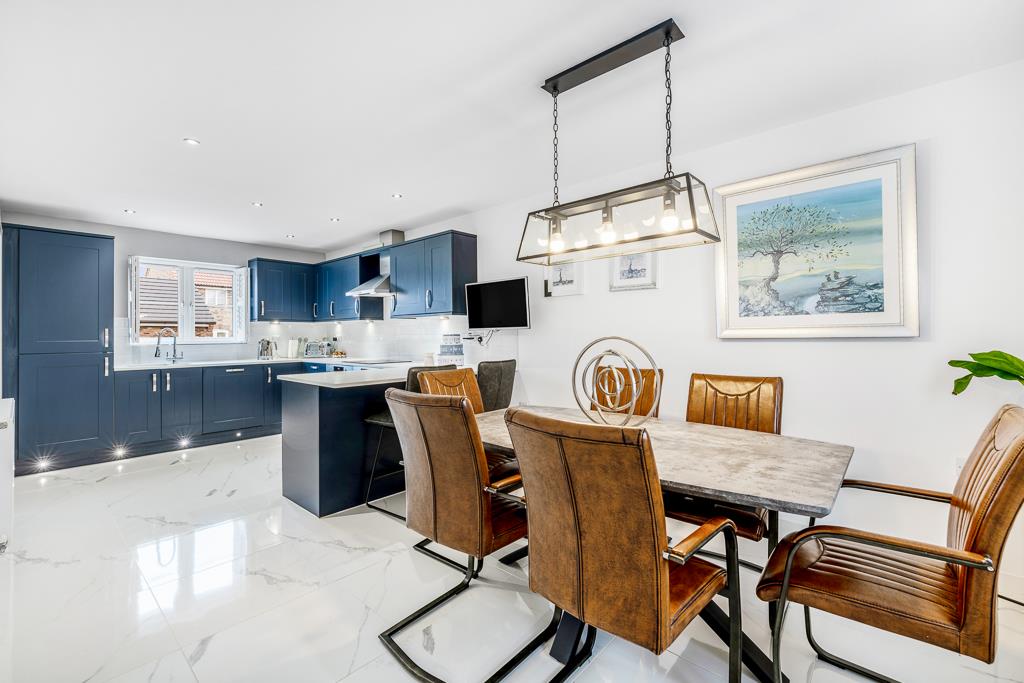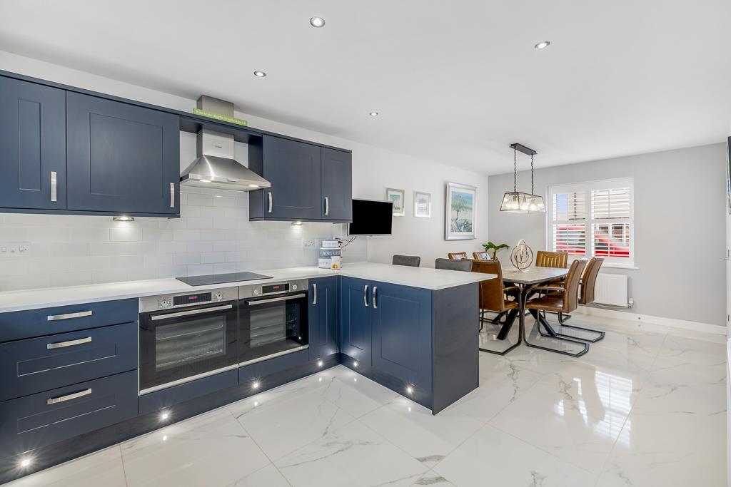 PVC double glazed windows to front and rear with built in shutters. Skimmed ceiling. Recessed spot lighting to kitchen and pendant lighting to dining area. Tiled flooring. Two radiators. Fitted with a matching range of base and eye level units with Minerva worktops over with moulded sink drainer grooves. Inset stainless steel sink with chrome mixer tap over. Tiled splashbacks. Four ring Bosch induction hob with stainless steel Bosch extractor fan. Twin Bosch electric ovens. Integrated dishwasher. Integrated fridge freezer. Door to utility room.
