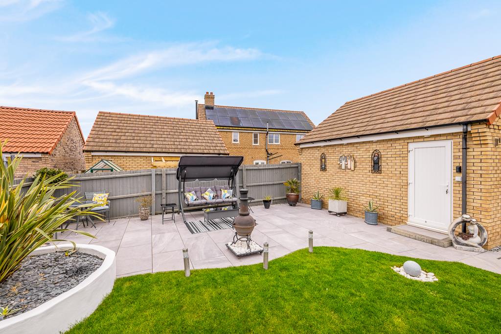 The rear garden is enclosed by timber fencing. Fully landscaped to include two porcelain patio seating areas and lawn. Gravel planted borders and raised beds. There is outside power points, lighting and cold water tap available. Door opening to double garage.