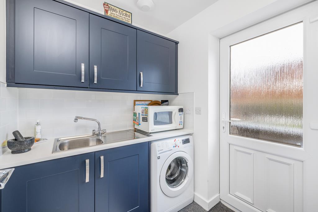 PVC double glazed door to rear. Skimmed ceiling. Recessed spot lighting. Extractor fan. Tiled flooring. Fitted base and eye level units with Minerva worktop space over. Tiled splash back. Stainless steel sink and drainer and mixer tap. Space and plumbing for washing machine.