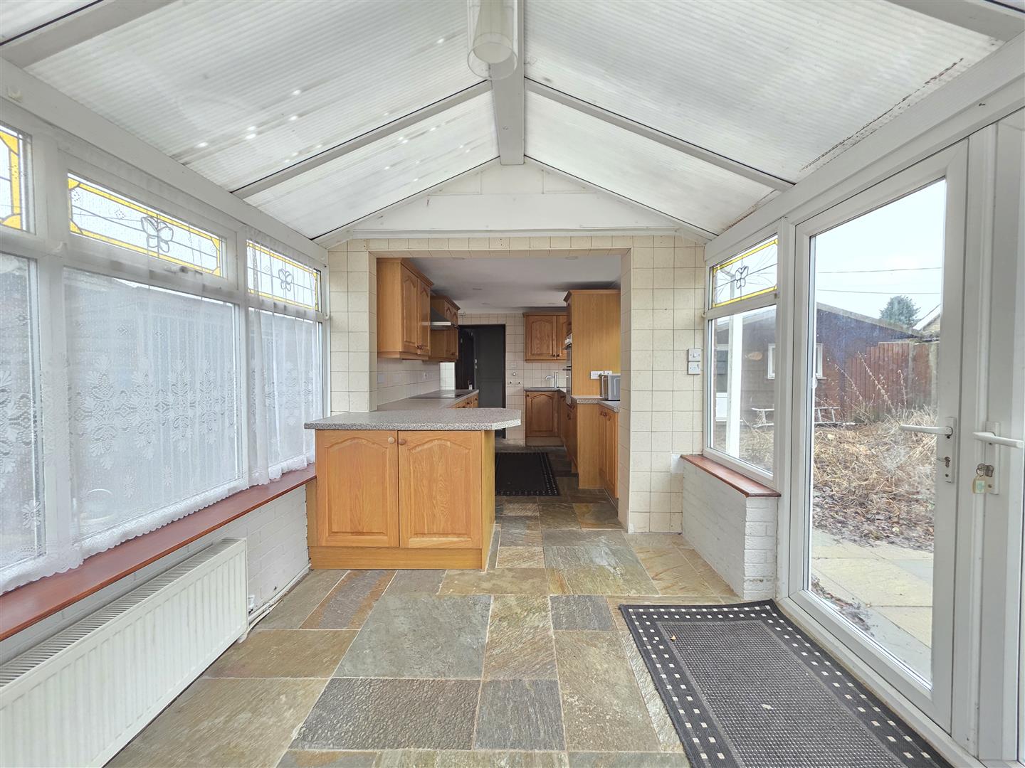 PVC double glazed windows to side and rear. Door to side. Skimmed ceiling with recessed spot lighting. Conservatory roof to dining area. Stone flooring. Fitted base and eye level units. Four ring electric hob with extractor hood over. Integrated eye level oven and grill. Stainless steel sink and drainer with chrome mixer tap.