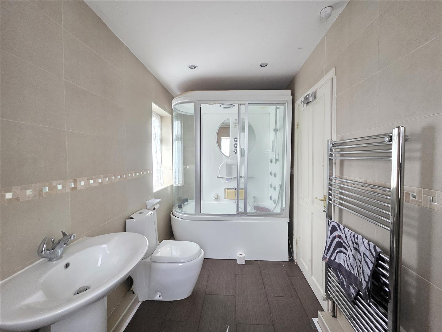 PVC double glazed window to rear. Coving to ceiling with recessed spot lighting. Tiled flooring. Towel rail. Fitted tiled shower enclosure with glass door. Close coupled toilet. Wash hand basin.