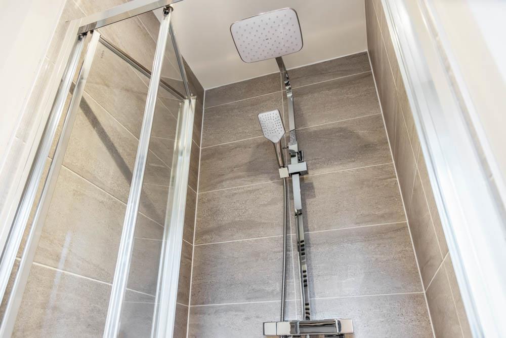 Window to front. Shower cubicle. Wash hand basin. Toilet. Vinyl flooring.