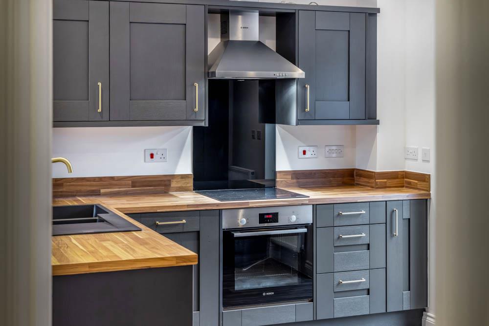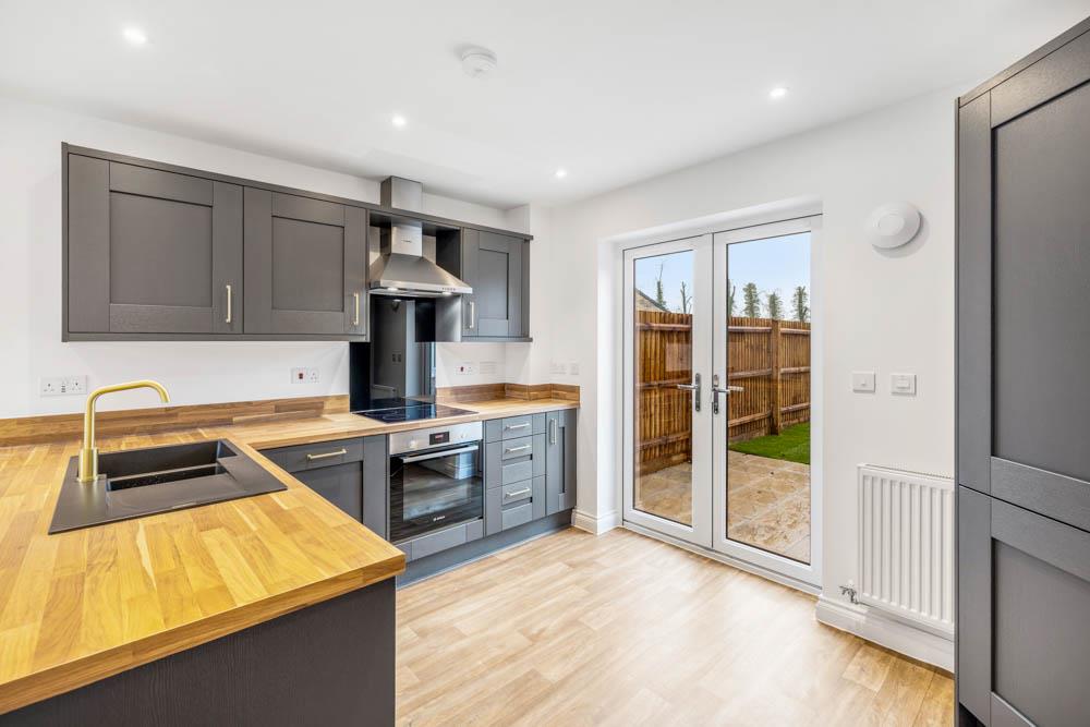 Window to front. French doors to rear. Matching base and eye level units with work surfaces over. Sink unit with drainer and mixer tap. Space and plumbing for washing machine. Built in oven. Induction hob with extractor hood over. Integrated dishwasher. Integrated fridge/freezer. Vinyl flooring.