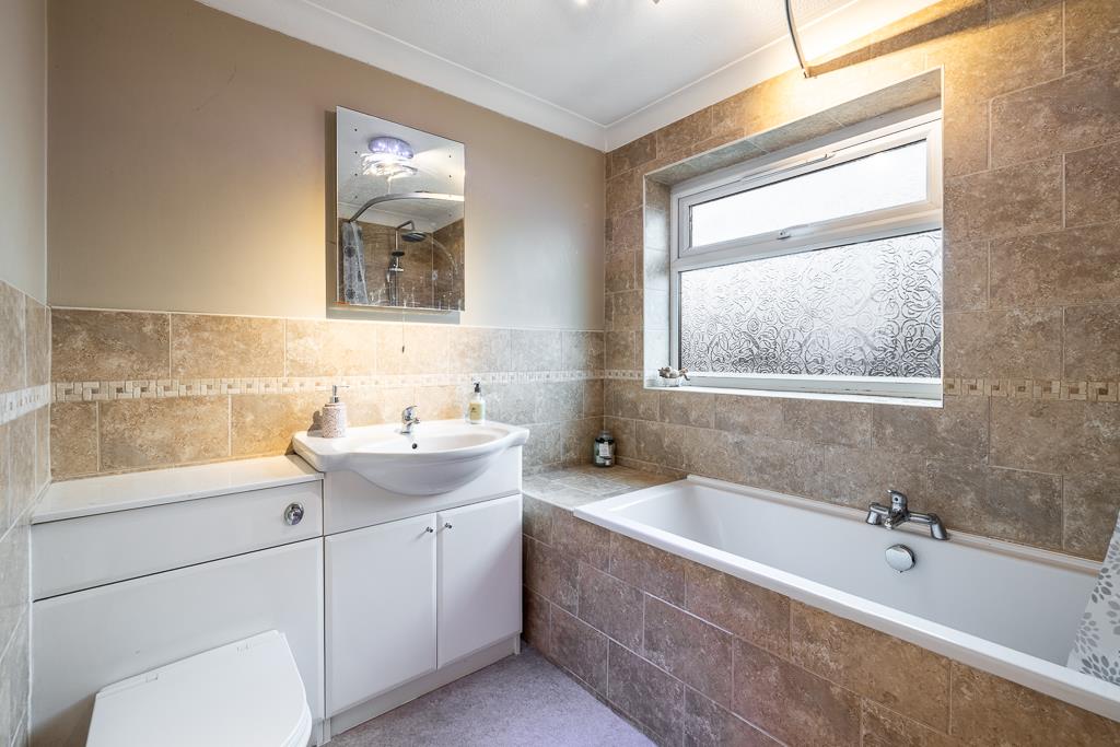 UPVC window to rear. Panelled bath with rainfall head shower and separate shower attachment. Wash basin and toilet set in vanity unit. Partially tiled walls. Wall mounted heated towel rail. Extractor fan. Vinyl flooring.