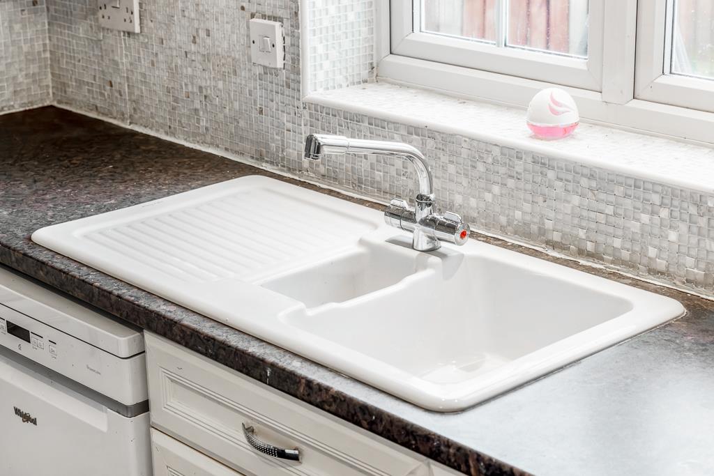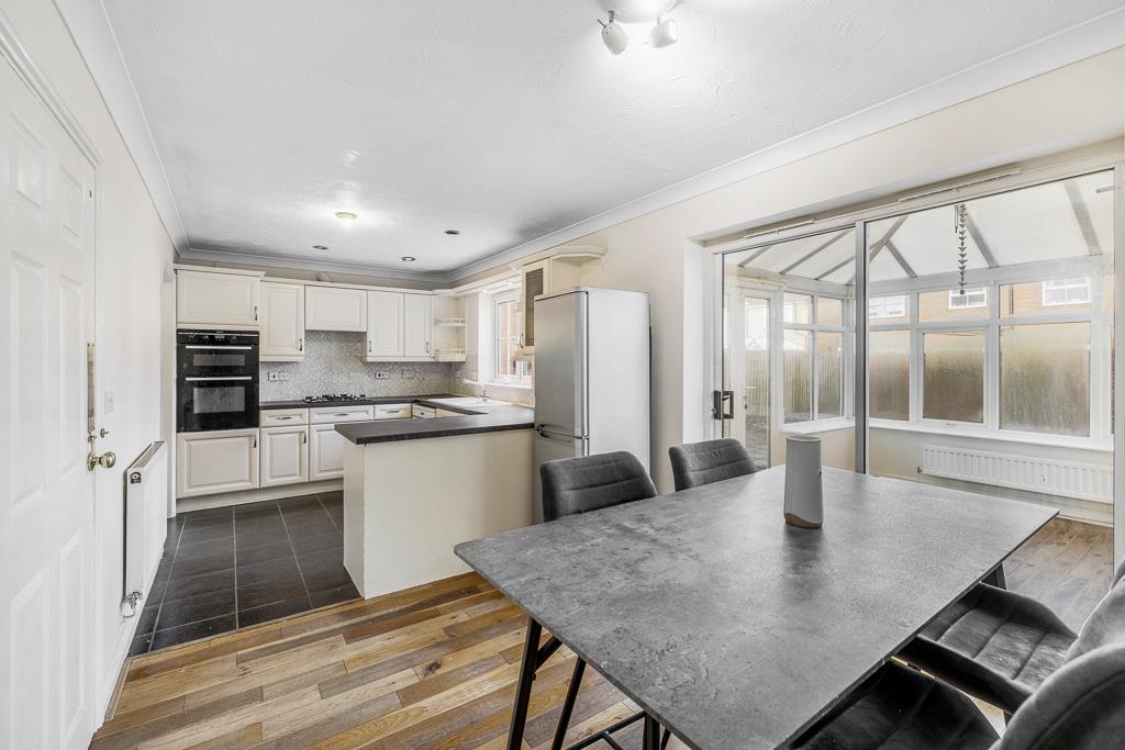 PVC double glazed window and aluminium sliding doors to rear. Two radiators. Coving to ceiling. Tiled and wood flooring. Fitted base and eye level units with roll edged work surfaces and tiled splash backs. Four ring gas hob with extractor hood over. Integrated eye level oven and grill. Space and plumbing for washing machine and dishwasher. Space for fridge/freezer. Ceramic sink and drainer with chrome mixer tap and tiled splashbacks. Door to utility.