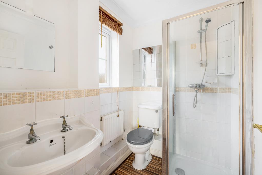 PVC double glazed window to side. Coving to ceiling. Extractor fan. Shaver point. Radiator. Vinyl flooring. Fitted with three piece suite comprising glazed shower cubicle with mains shower. Pedestal wash hand basin. Close coupled toilet with push button flush.
