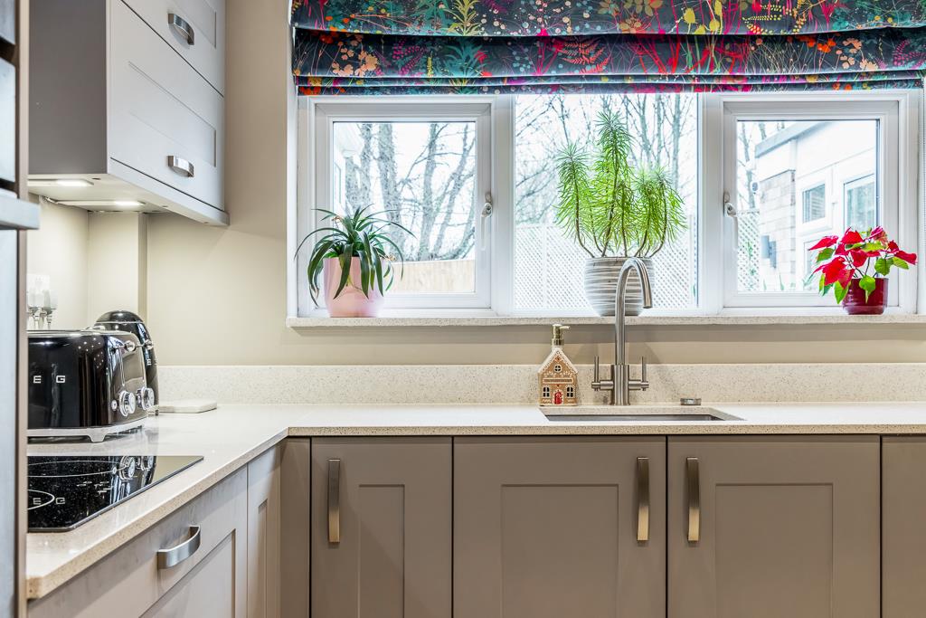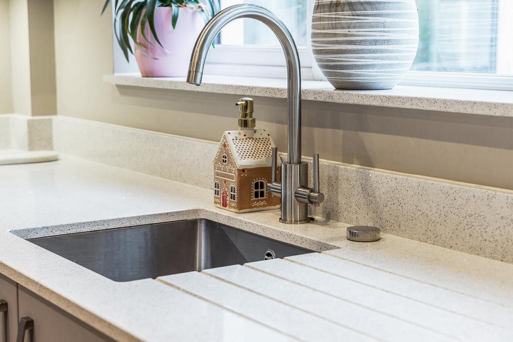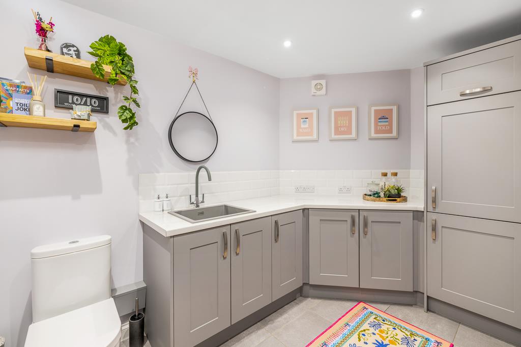 Skimmed ceiling with recessed spot lighting. Extractor fan. Tiled flooring. Vertical column radiator. Fitted base units with roll edge work surface and tiled splash back. Inset composite sink with mixer tap over. Built in utility cupboard with space and plumbing for washing machine and tumble dryer.