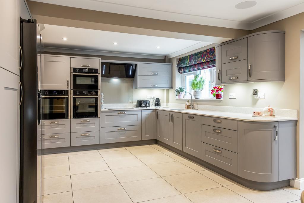 PVC double glazed window to rear. Coving to skimmed ceiling with recessed spot lighting and built in speakers. Tiled flooring. Vertical column radiator. Fitted with a matching range of base and eye level units with quartz work surfaces and matching upstands. Four ring induction hob with splash back and extractor hood over. Integrated twin Neff eye level hide and slide oven and combination oven. Integrated dishwasher. Space and plumbing for American style fridge/freezer.