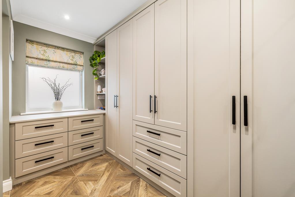 PVC double glazed window to rear. Coving to skimmed ceiling with recessed spot lighting. Tiled flooring with under floor heating. Bespoke fitted furniture comprising wardrobes, drawers and shelving units. Opening to en-suite