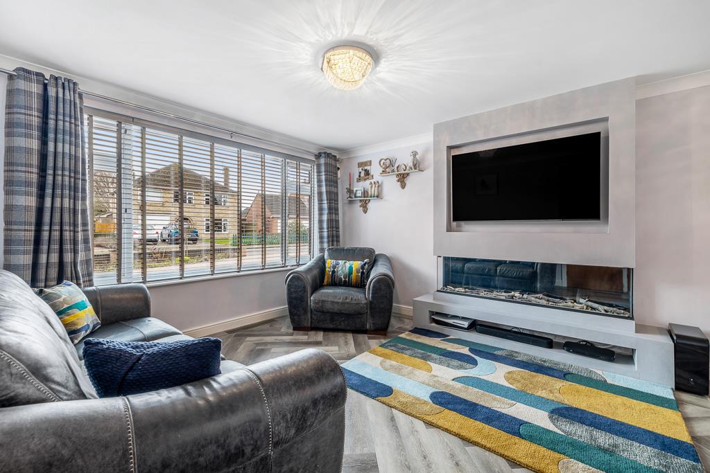 PVC double glazed window to front. Glazed door to side. Sliding patio doors to rear. LVT flooring. Radiator. Built in media wall with inset living flame gas fire. TV recess and console storage area.