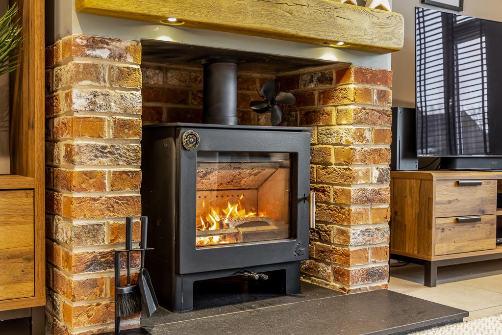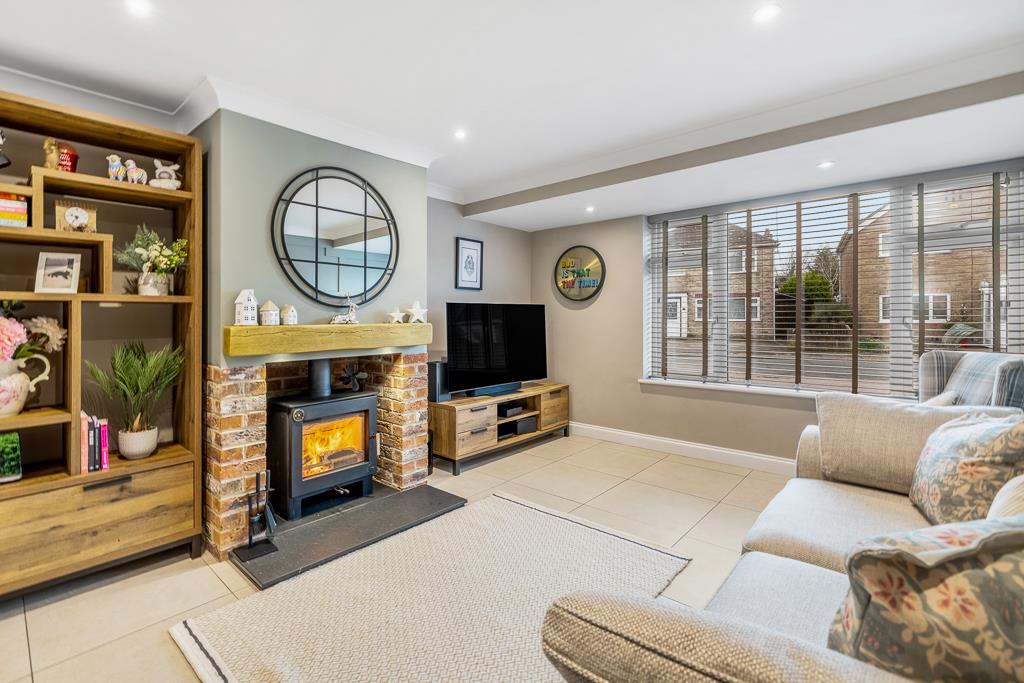PVC double glazed window to front. Coving to skimmed ceiling with recessed spot lighting and built in speakers. Tiled flooring. Vertical column radiator. Exposed brick fireplace with granite hearth and cast iron log burner.